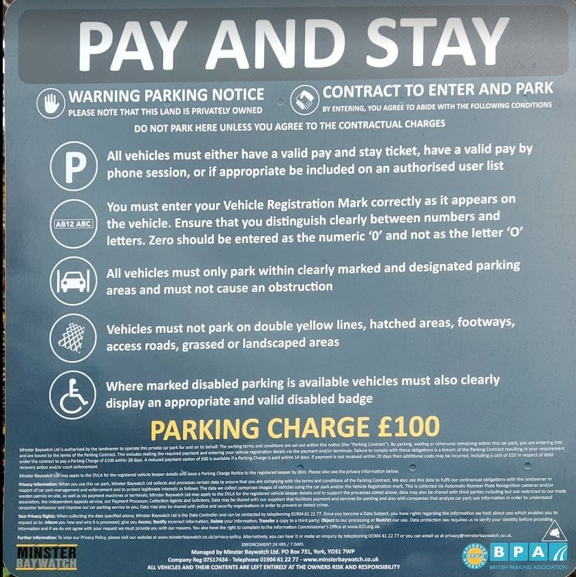 The entrance to the car park is sign posted but many of the bays are not and it's not clear what the terms and conditions were. The in/out equates to 40 minutes. Also the amount (£250) is fairly ludicrous.
