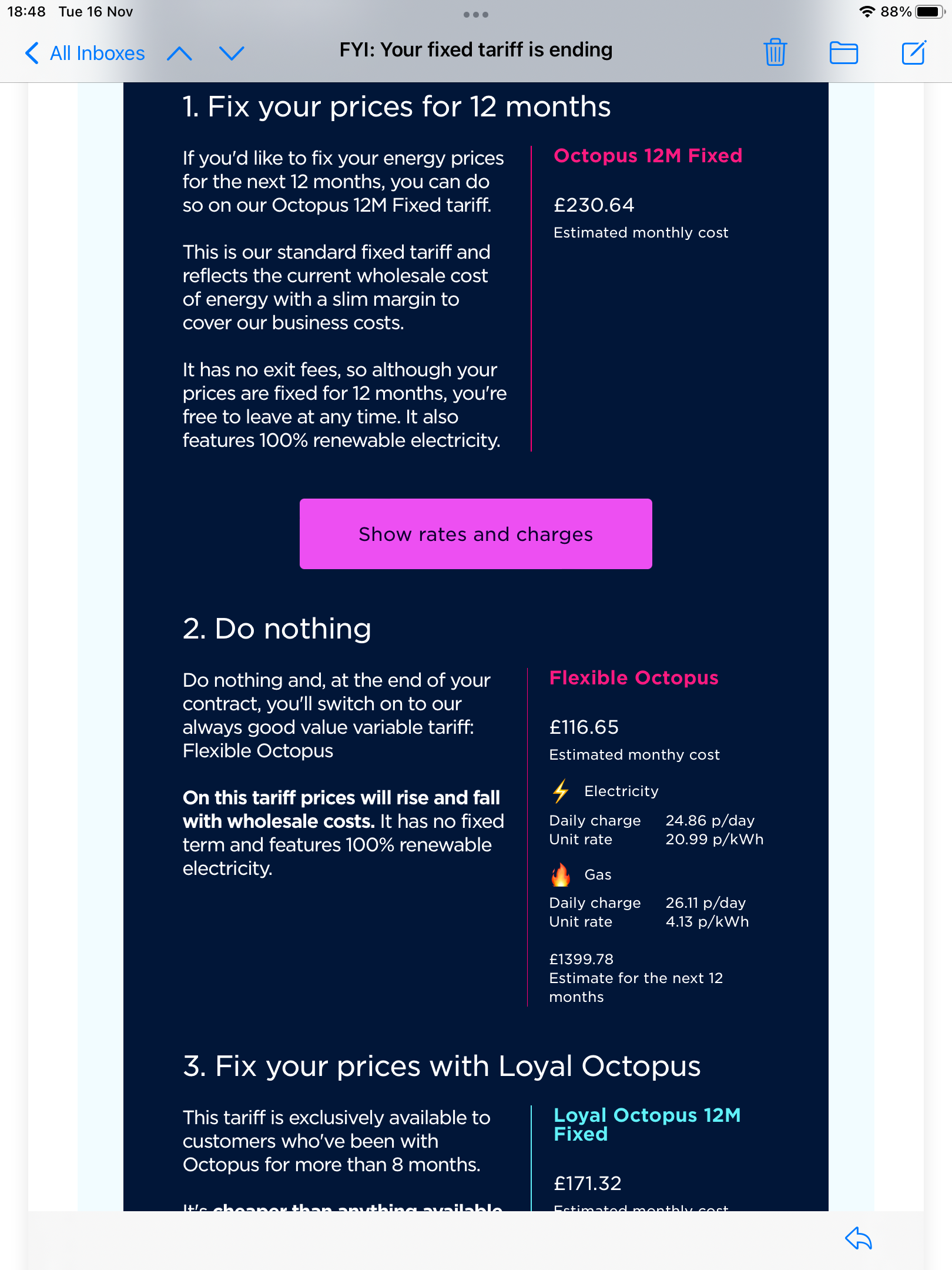 So if you do nothing you pay £116 or if you switch to a fixed rate you pay £171. I know which I'd do and it isn't taking the fixed rate. It's a very different situation to normal when the price cap was the worst option to have.RhiBi said:Based on this email, it seems do nothing is my best option, or should I look to switch? This was sent on 29/10Remember the saying: if it looks too good to be true it almost certainly is.0 -
