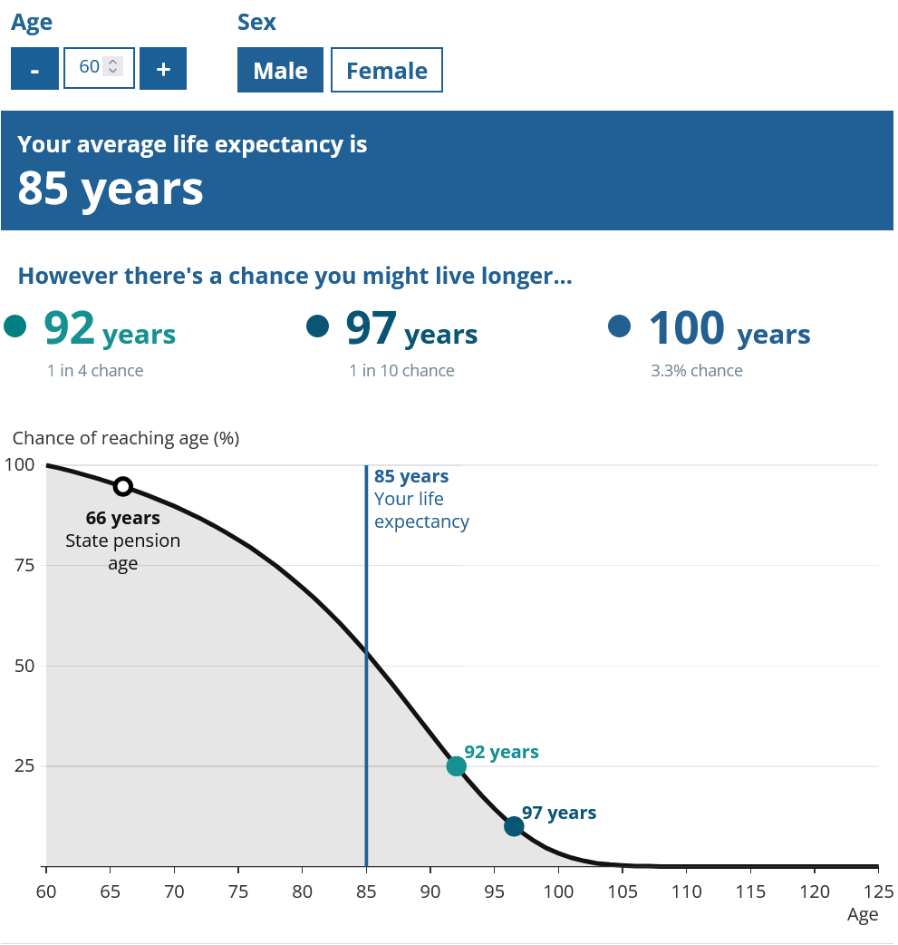 Age 84 ( man ) and 86 ( woman) is the average life expectancy for a 60 year old .drummersdale said: