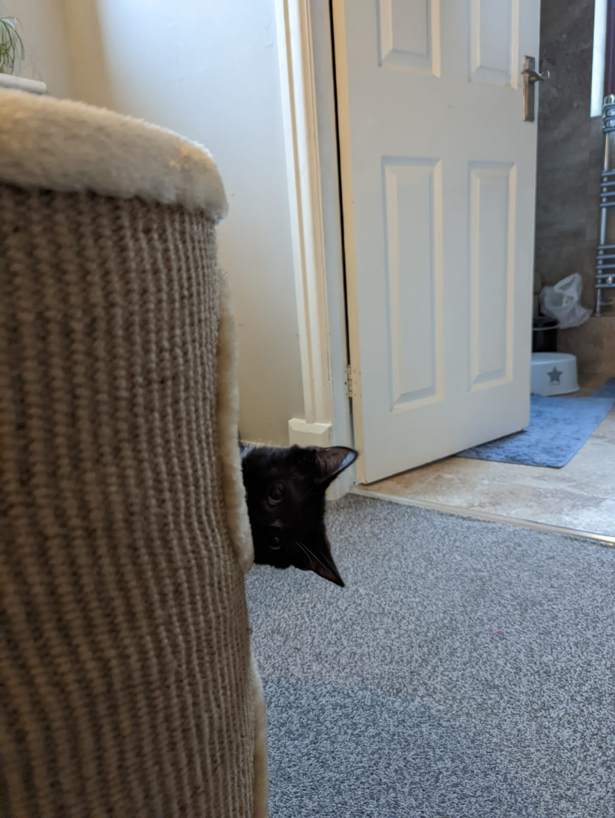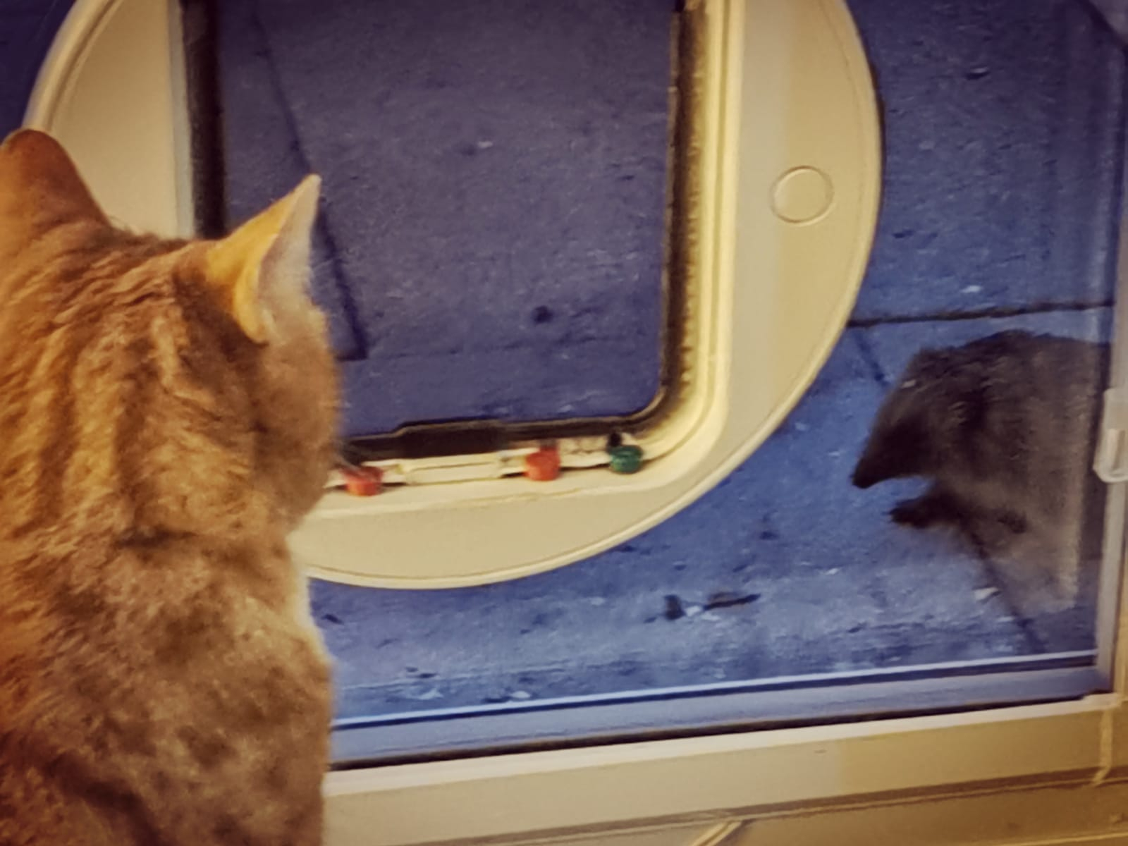 Love everyone's adorable housemates! Ours is called Ollie. Here's a pic taken last summer of him peering through the cat flat at his gardenmate, Harriet the Hedgehog.