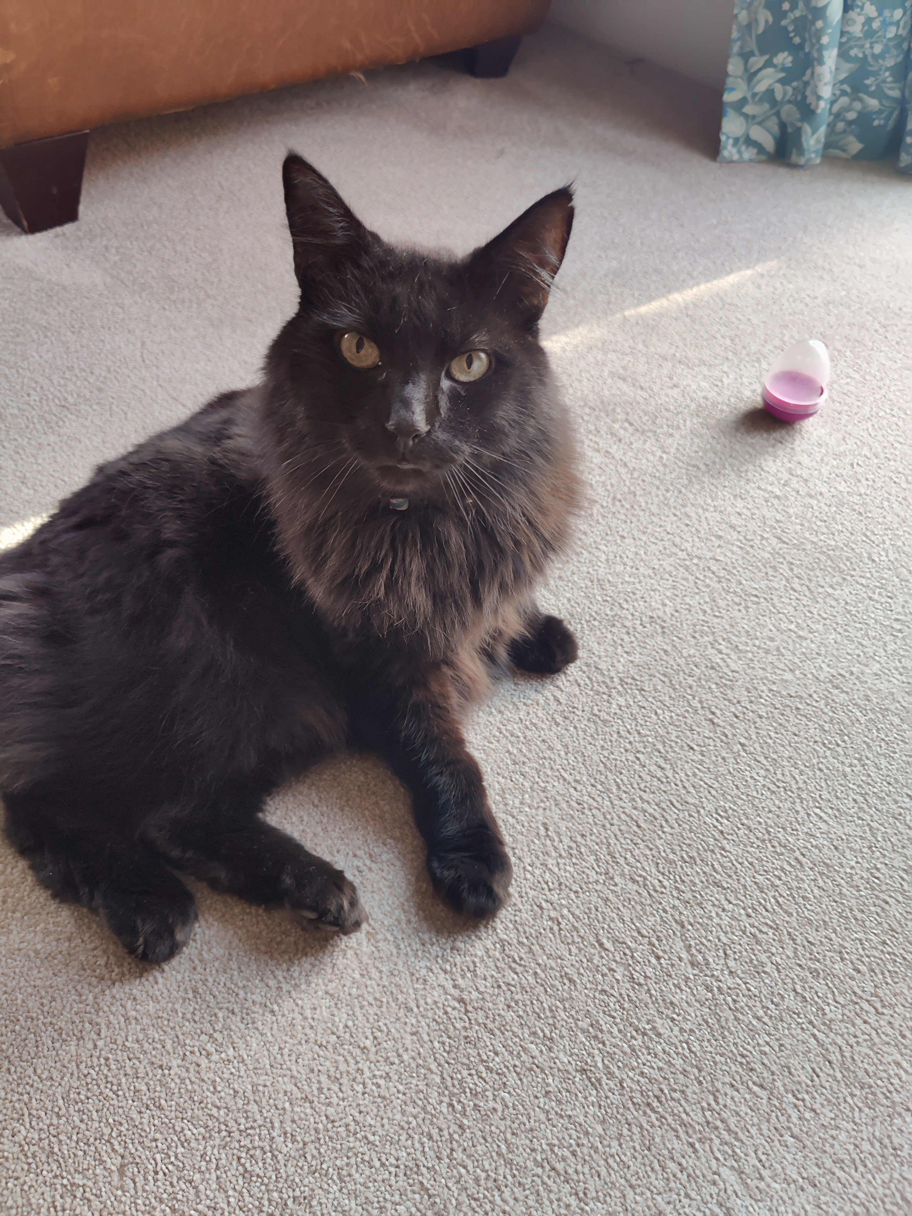 On the right we have long-suffering Misty Marples aka Misty Miaows-a-lot aka Misty Dreamboat aka Misty Moomin. She's a lover not a fighter who puts up with a lot of surprise attacks from McSheetens and looks after us by serenading us each night to let us know she has brought us precisely one (1) earthworm as a gift for the house.