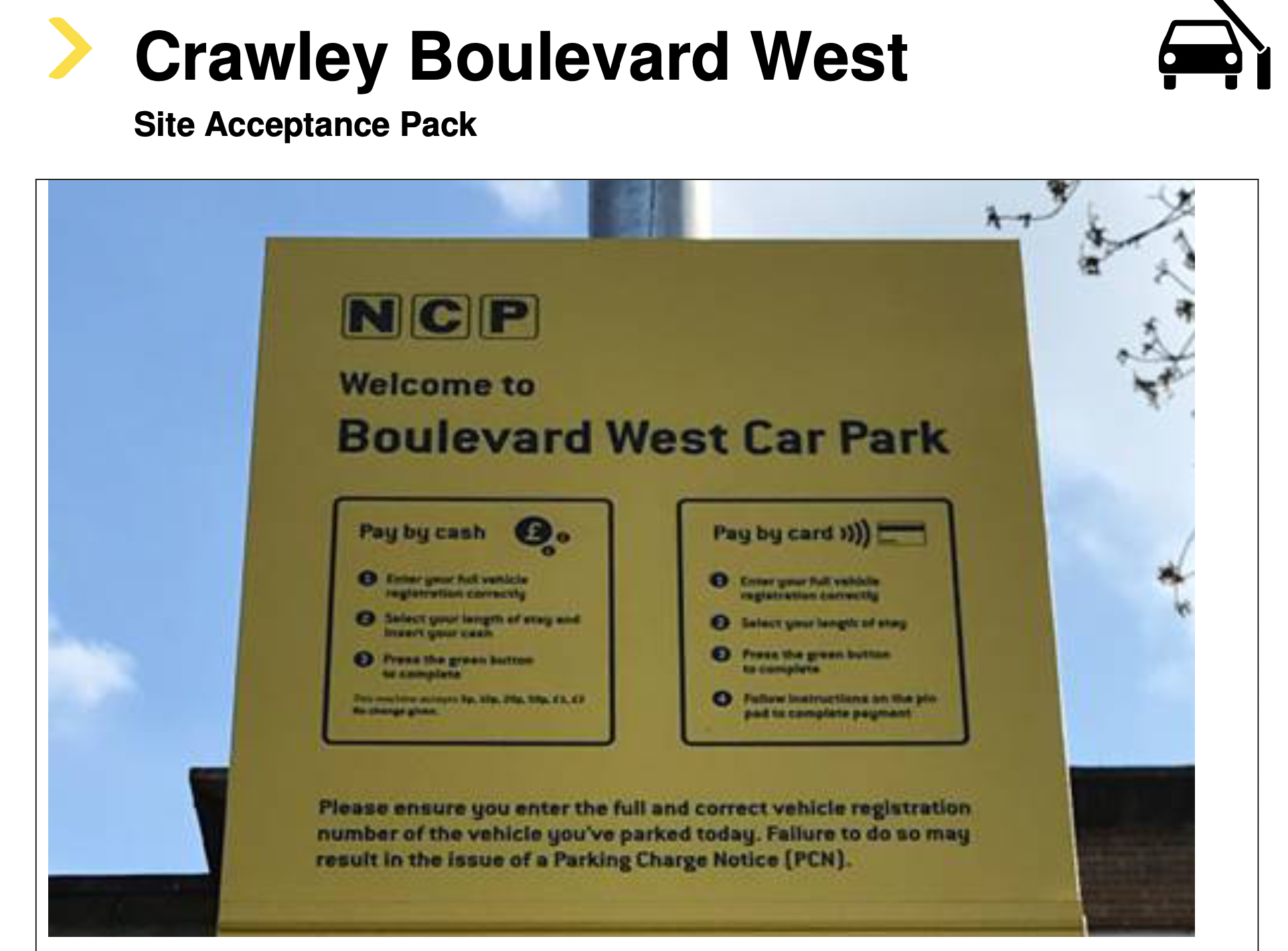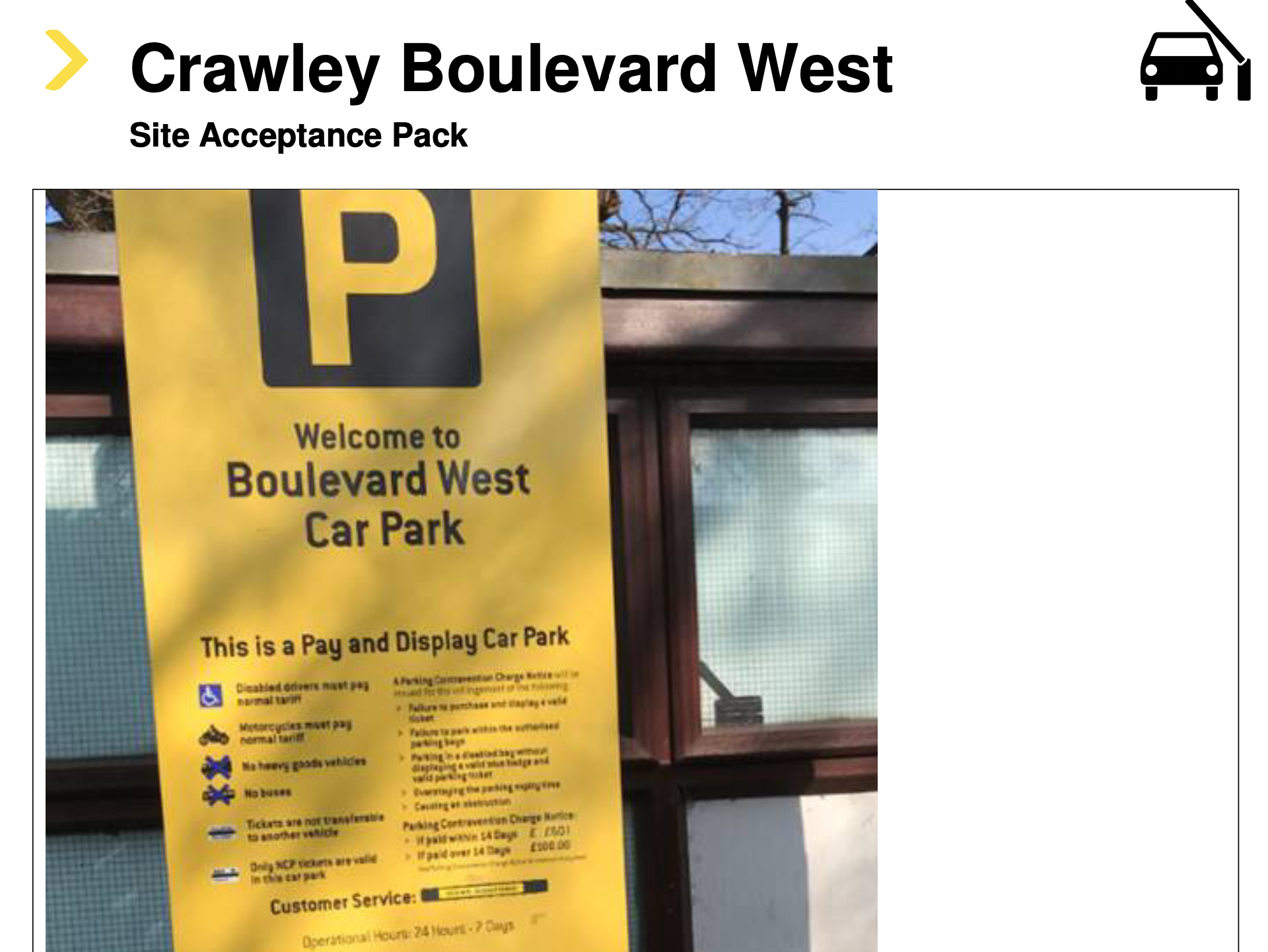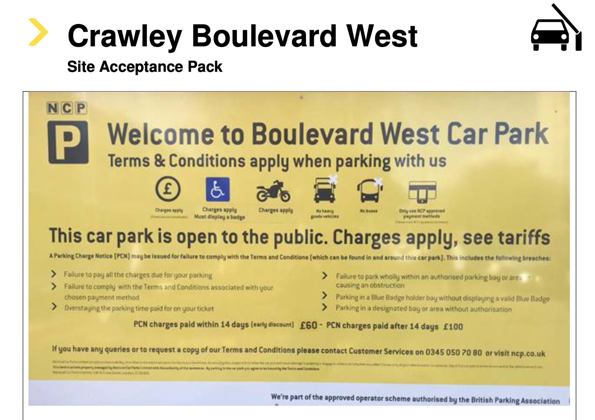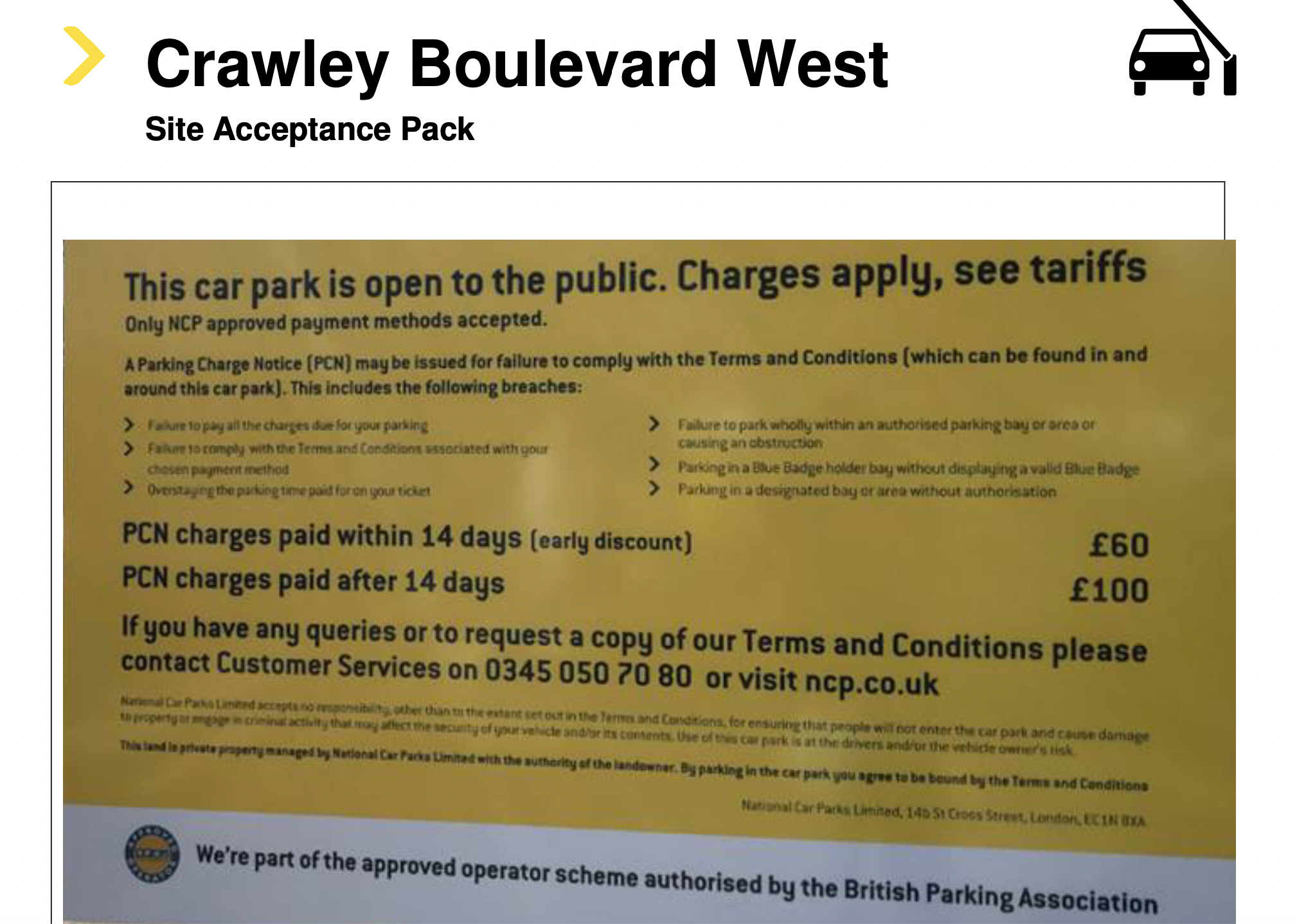 The Car Park is private land, operated and managed by our Client. Use of the Car Park, by any motorist, is on the basis of the displayed contract terms and conditions, with the motorist legally obliged to make themselves aware of the terms and conditions at the time of parking.