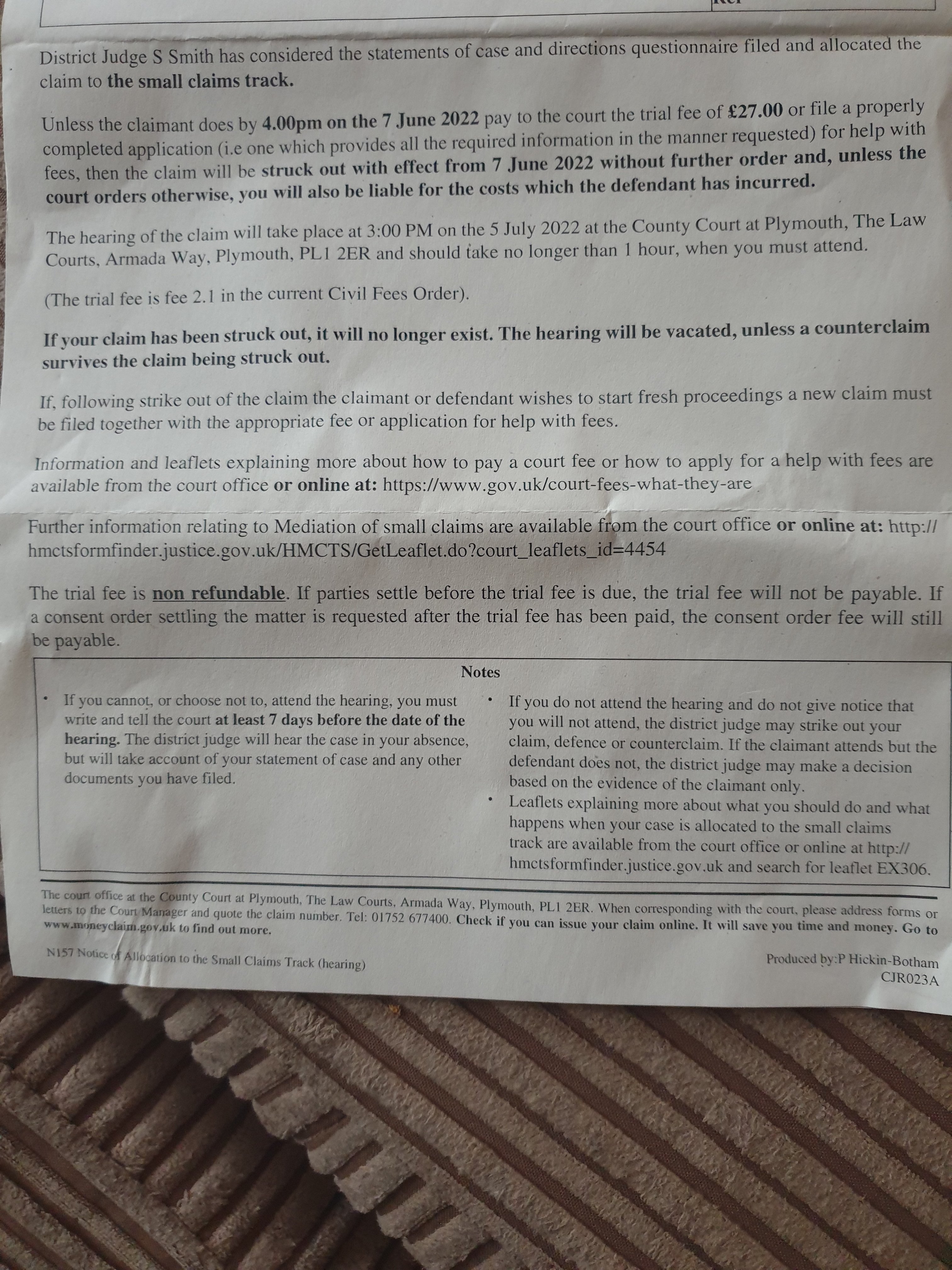 Yes. (We cross-posted)Le_Kirk said:On your notice of allocation (letter from the court) was there a date by which you and the claimant had to file and serve witness statement and evidence? There should also be a date by which the claimant should pay the hearing fee.