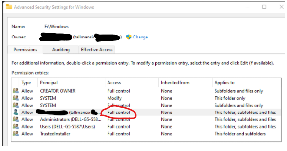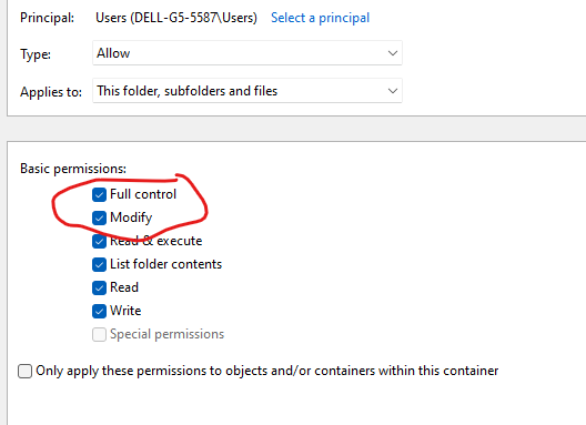 Then check your user has "Full Control", if not click on it and select the tick boxes.