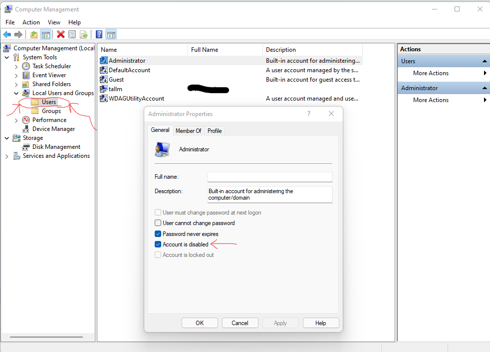 3. Open the "Administrator" account and have a look at the properties as per screenshot below: