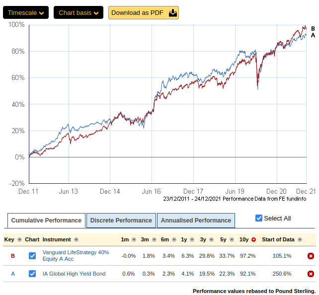 I broadly agree with some of the points raised in the article (low correlation with investment grade, more correlated to equities, less volatile than equities), but not others (similar total return to equities), nor the conclusion that they add diversification in addition to a mixture of equities and investment grade bonds, I submit the above chart as Exhibit A vs diversification. I'm sure I don't need to show you the equivalent with VLS100 to counter the suggestion total return is comparable.I think a case can be made for holding them instead of equities if you are a cautious investor (although I would look to other options personally, those which we have discussed elsewhere), or if you are an adventurous investor you could add them during a bear market and sell them as late as you dare during a bull market (better stated by dunstonh above).Where they might have value (I simply don't know) is in a rising interest rate environment. On a simple price basis, you wouldn't expect them to lose value in the same way as lower yielding debt, but on the other hand the companies issuing the debt are likely to be less resilient to those conditions and may well struggle with refinancing leading to increased defaults. Interest rates rising from practically nothing to "normal levels" is uncharted territory, pun intended.1 -