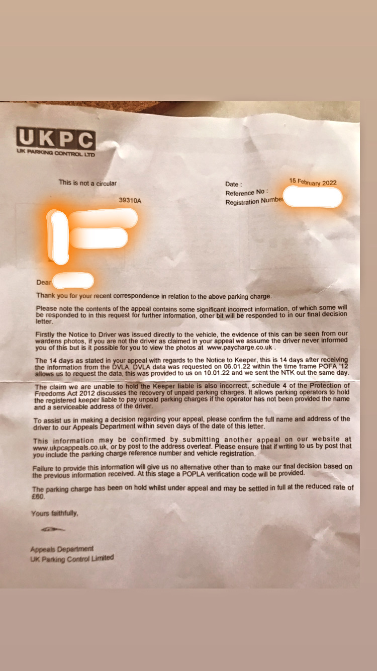 I get a NTK, now I wıill use the template in blue text and add a one liner stating that no NTD for vehicle registration X was given, therefore the strict requirements of the PoFA have not been met and the keeper cannot be held liable.