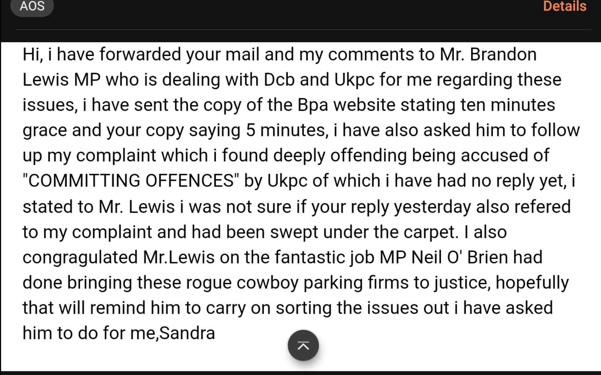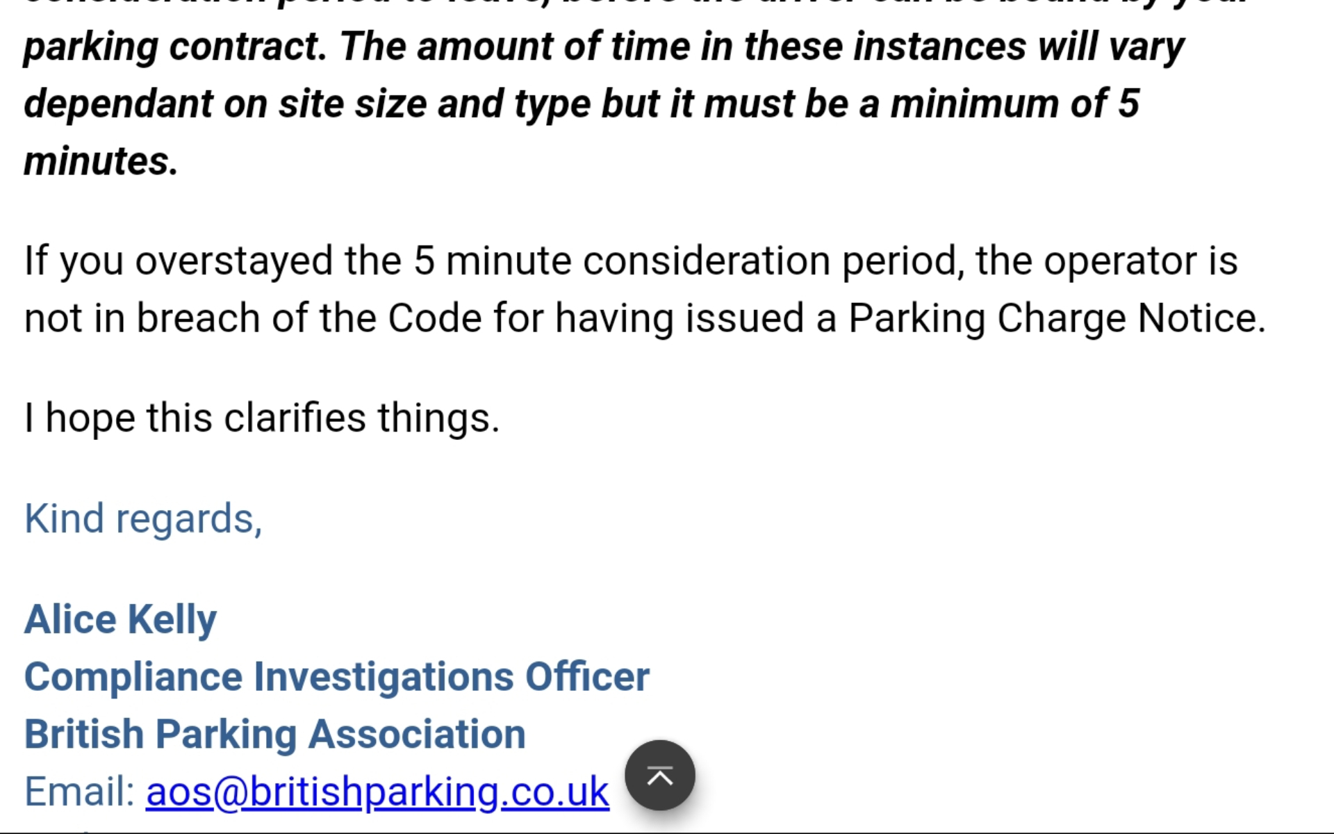 I made a complaint to Bpa recently regarding Ukpc saying i had committed " PARKING OFFENCES" i told them i was deeply offended being accused of any such thing and ask them to investigate Ukpc regarding this matter. Gemma from Bpa said she will investigate. I also referred to the Bpa website saying a ten minute grace period should be observed, it was obvious Bpa were going to stand by Ukpc but i wanted to let them know anyway, here is their reply and my response back to them