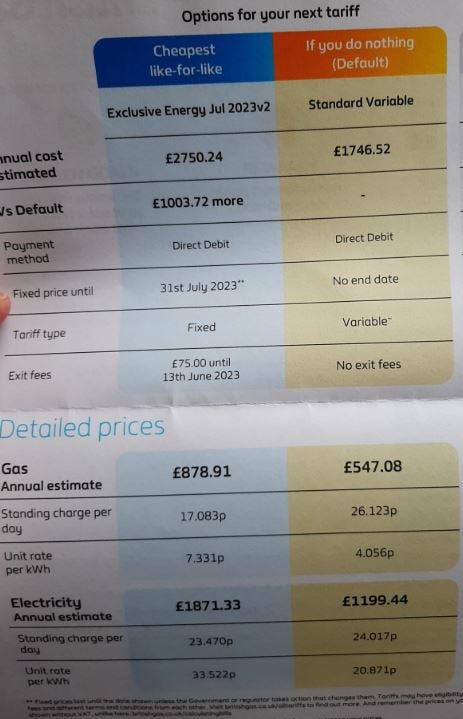 The only thing that BG can say with any certainty is what their 'like for like' will cost with whatever usage rates have been used for your circumstances. What they are unable to state is what the SV costs and tariffs will will as there will be at least 3 increases in the SV 'cap' between now and July 2023. So the situation is not as clear cut as it might appear.MuckChucker said:Received from BG yesterday - fairly easy decision for the moment tbh