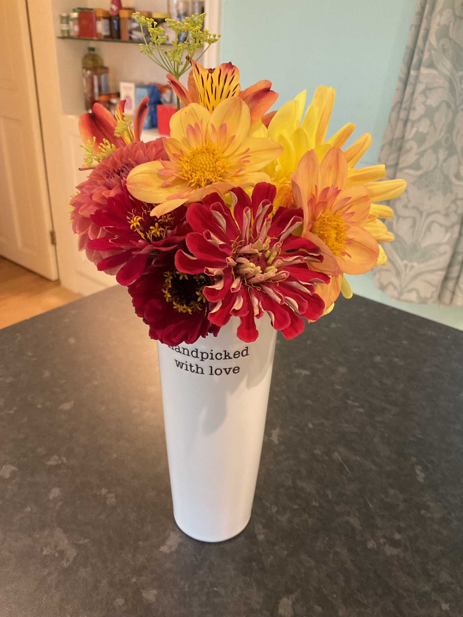 When I got home Mr KK was out so I spent 10 minutes in the garden deadheading the cut flower bed and then cut myself some flowers as an antidote for myself before the rain started again! 😊