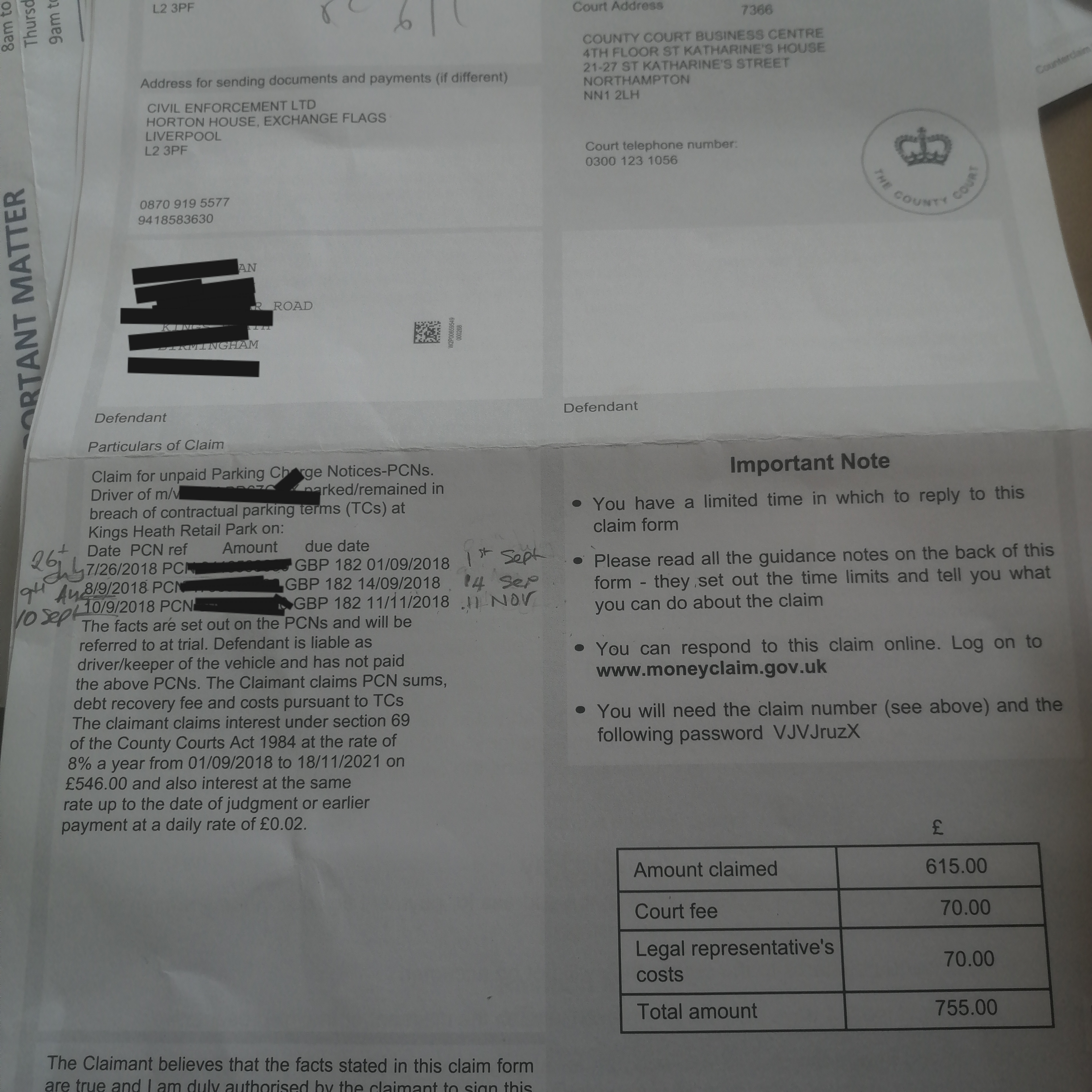 *different (oops)part twoBACK STORYMy son checked his credit file earlier this week and discovered a CCJ. He called the court and discovered there was a judgment against him dated 13th DecemberRequested a N224 from courtHe went to his old address on 8th Jan and picked up a pile of letters (person who lives there sometimes gives them to the shop below, but it's far from consistent. The tenant apparently also tours and sometimes landlord will pick up some post, so a bit hit and miss)There was a claim form dated 19th November and Judgment for Claimant (in default) dated 13th December 2021 plus 2 other unconnected letters dated Oct/Nov).He can obtain witness statements regarding post handed into the shop.I have attached redacted copy of claim form with inconsistent date formulas for some unknown reason?? (mm/dd/yyyy for date and dd/mm/yyyy for date due).Tickets date back to July/Sept/Nov 2018. He moved out of the property in June 2018 (have final energy bill as proof of this)Some time in 2019 there was another claim issued against him but (I will ask him for more info) I understand it didn't go any further after he filed his defence.SAR typed ready to send to CELDEFENCEOn 1st September 2021 he emailed CEL informing them he had been given some letters from his old address and requesting that any information regarding his old vehicle and old address be removed from their system as previously requested (attached)On 27th September 2021 he received a without prejudice save as to costs email with an offer of £300 settlement to which he did not reply.Therefore, it is clear the CEL were WELL AWARE that he did not live at that address.The email was sent from his work address which would have been very easy to trace (previous correspondence had also taken place in 2019 from the same email account)There are no soft searches on his credit file during that period (I will double check this with him today)He had a different vehicle in Sept 2021, which would not have been registered at his old address (not sure if this is relevant)He is not sure whether he updated the V5 when he moved out(?) but did change vehicles on (??? I will check with him) and would have had correct address registered to new vehicle (I think he has lease? cars)Electoral roll has been updated each time he moved house.His driving licence is registered at my home and always has been and nothing has been sent here from them.It is his belief that this Claim was filed at court knowing that he would not be able to file an AoS in a timely manner, much less a defence and that it would be easy to obtain a default judgment. Default Judgment was obviously applied for less than one month after the court issued the N1.As for ticket defence, I will use the Template from @couponmad in the newbies thread that I used in my previous case.Sorry for the long winded post, but tried to answer questions I see being asked after other initial posts and trying to minimise too much toing and froingAll help is, as always, greatly appreciated.