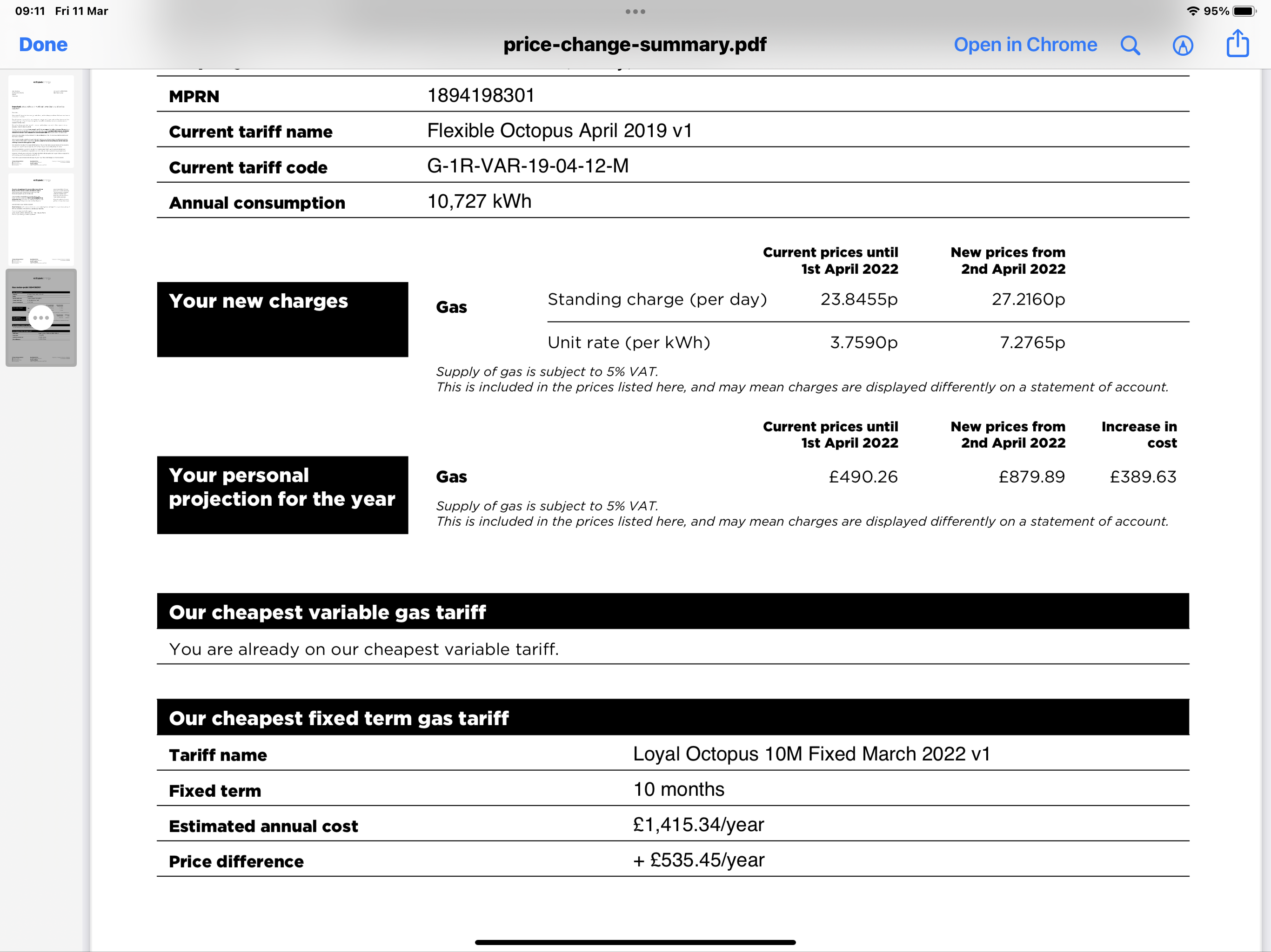 What you posted is the standard variable tariff, not a fixed rate.Alshamal said:I’ve just received this offer from Octopus for our gas fixed for 10 months! I’m on go for my electric @5/15p which ends in August but they can’t give me any advice on this now! But others on the EV forums are paying 7.5/30p after the increase! What’s anyones thoughts?