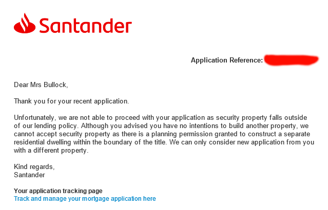 Just had a Mortgage from Santander refused because there is outline planning permission to build a bungalow at the back of the plot.