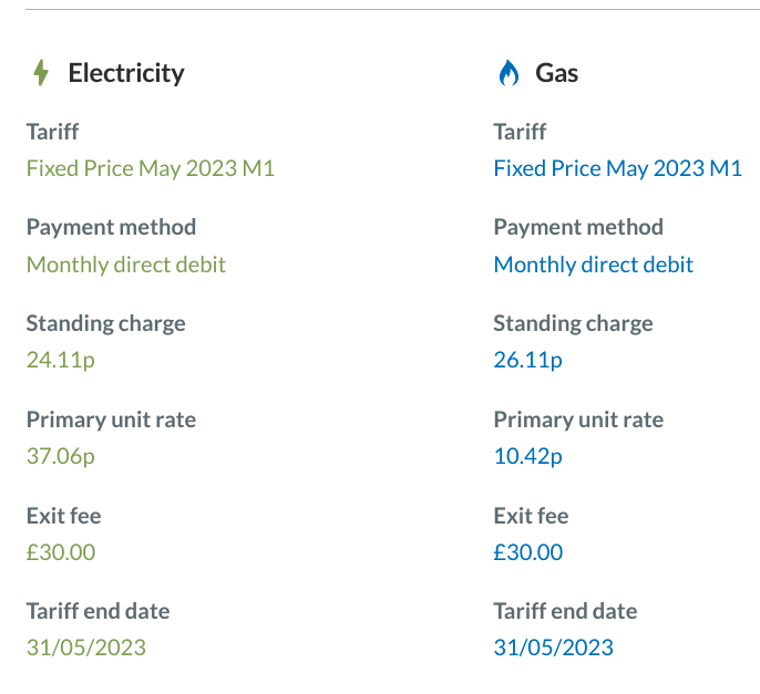 Electricity : Standing charge 21.64, Unit rate 22.72 (£30 exit fees)