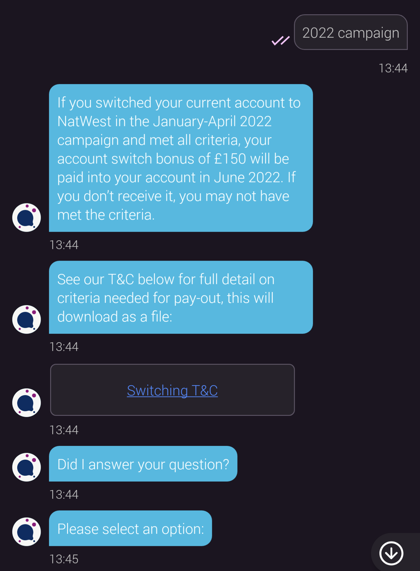 I contacted them a few days ago as I haven't received a text, to ask if I had met the criteria and noticed they had changed the wording on the bot reply for the campaign to "will be paid into your account in June 2022" when everything had previously said "will be paid into your account by 9th June 2022"