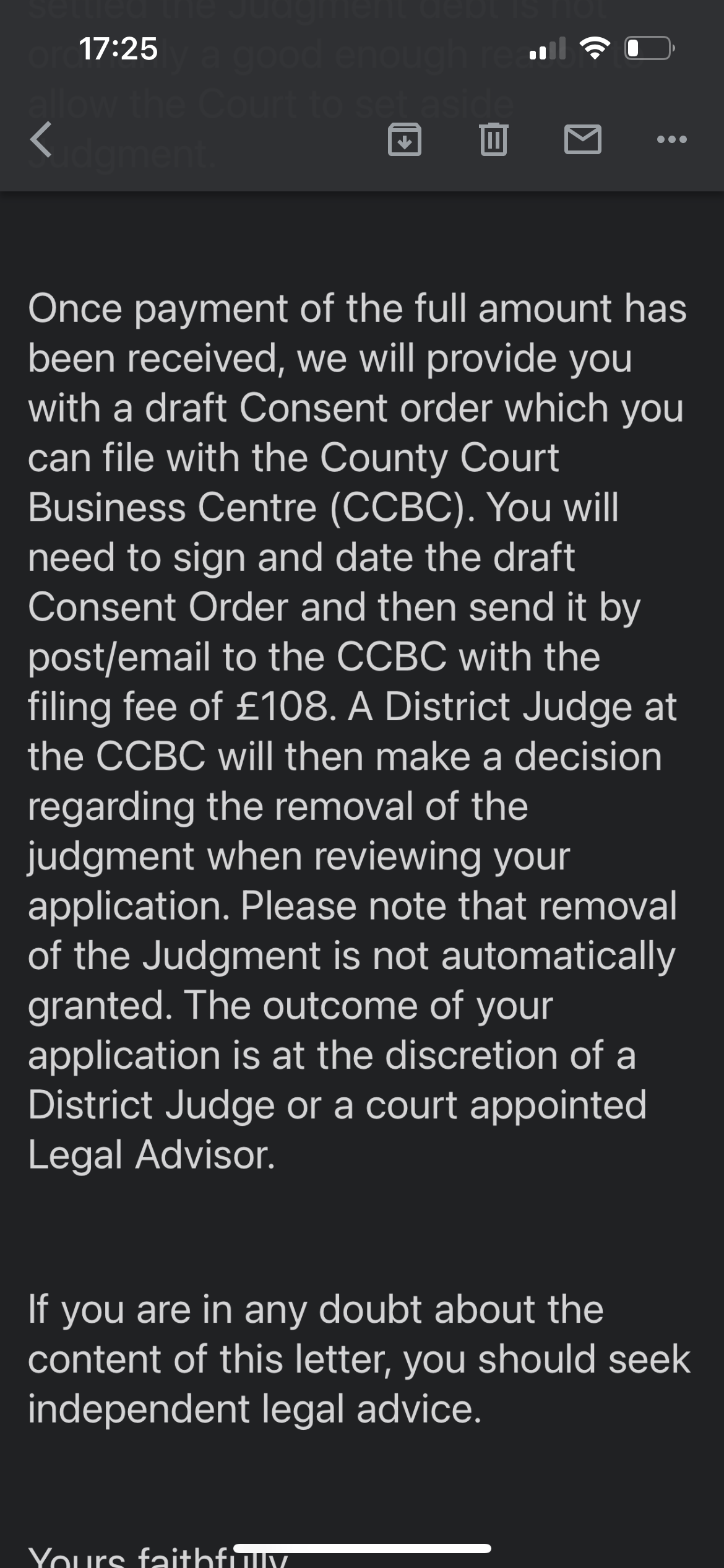my main hope is to get the ccj removed, I don’t mind if I have to pay or not