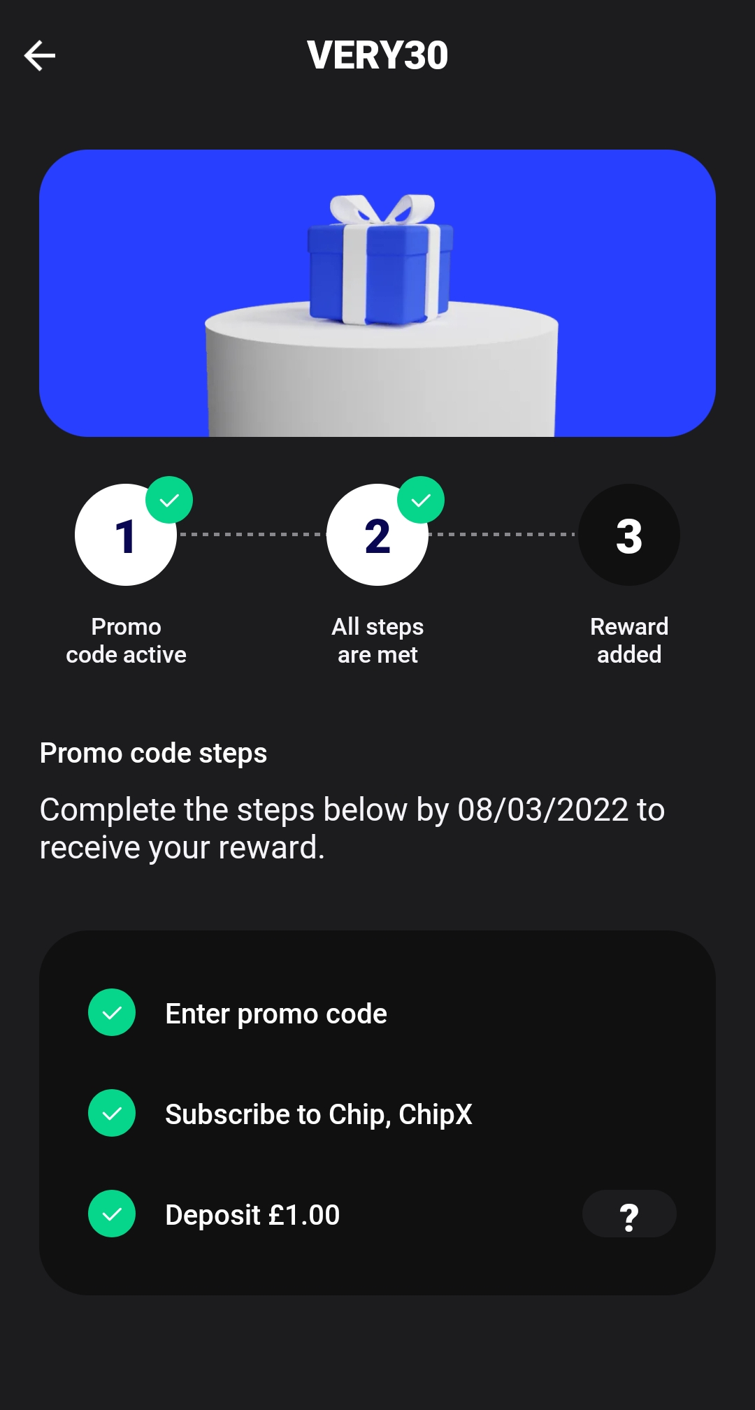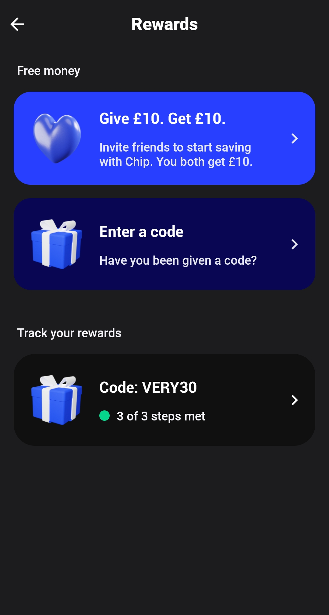 You have to link the app to your bank account and debit card, credit your Chip Saver with at least £1.01 via your debit card (I did £5 to be sure), and input code VERY30 on the Refer-a-Friend / Promo code page. It should then confirm