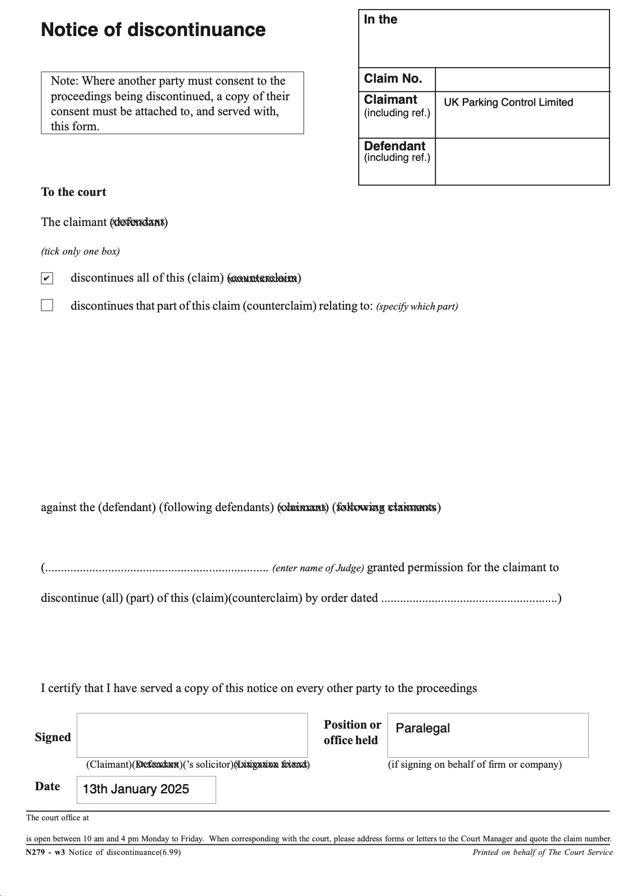 Our client has instructed us to discontinue Court proceedings and close our file. Therefore, please find enclosed the Claimant’s N279 Notice of Discontinuance for your records.