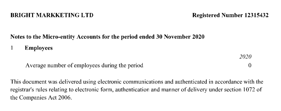 Company is registered as part of Bright Markketing (note spelling) Ltd.