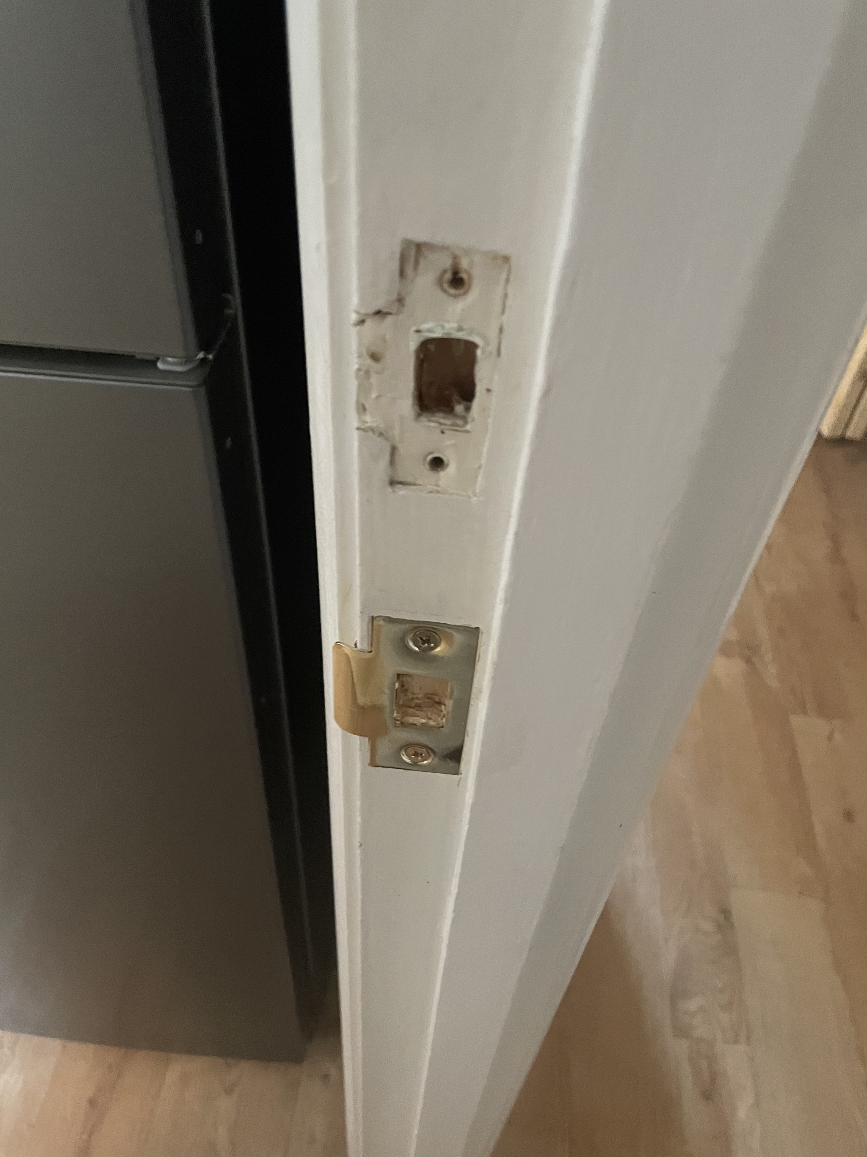 I rather naively assumed my new latches could just go where the old ones had been but due to the panelling on my new doors they had had to be put down lower. I am now left with big holes in the door frame where the old latches used to be.