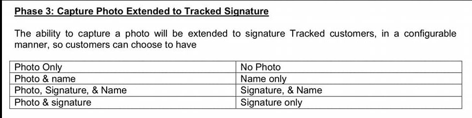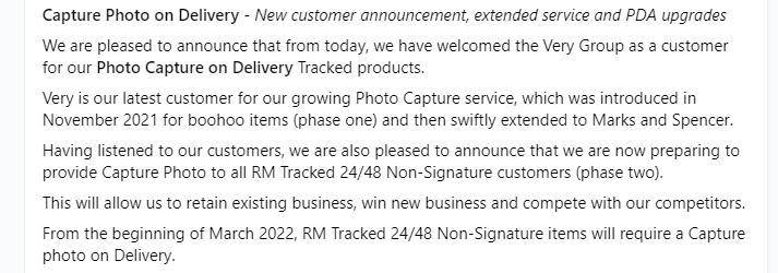 So what this means is all non signature Tracked will require a photo of the delivery at the door. NOT safeplaced but delivered either at an open door or through the letterbox.