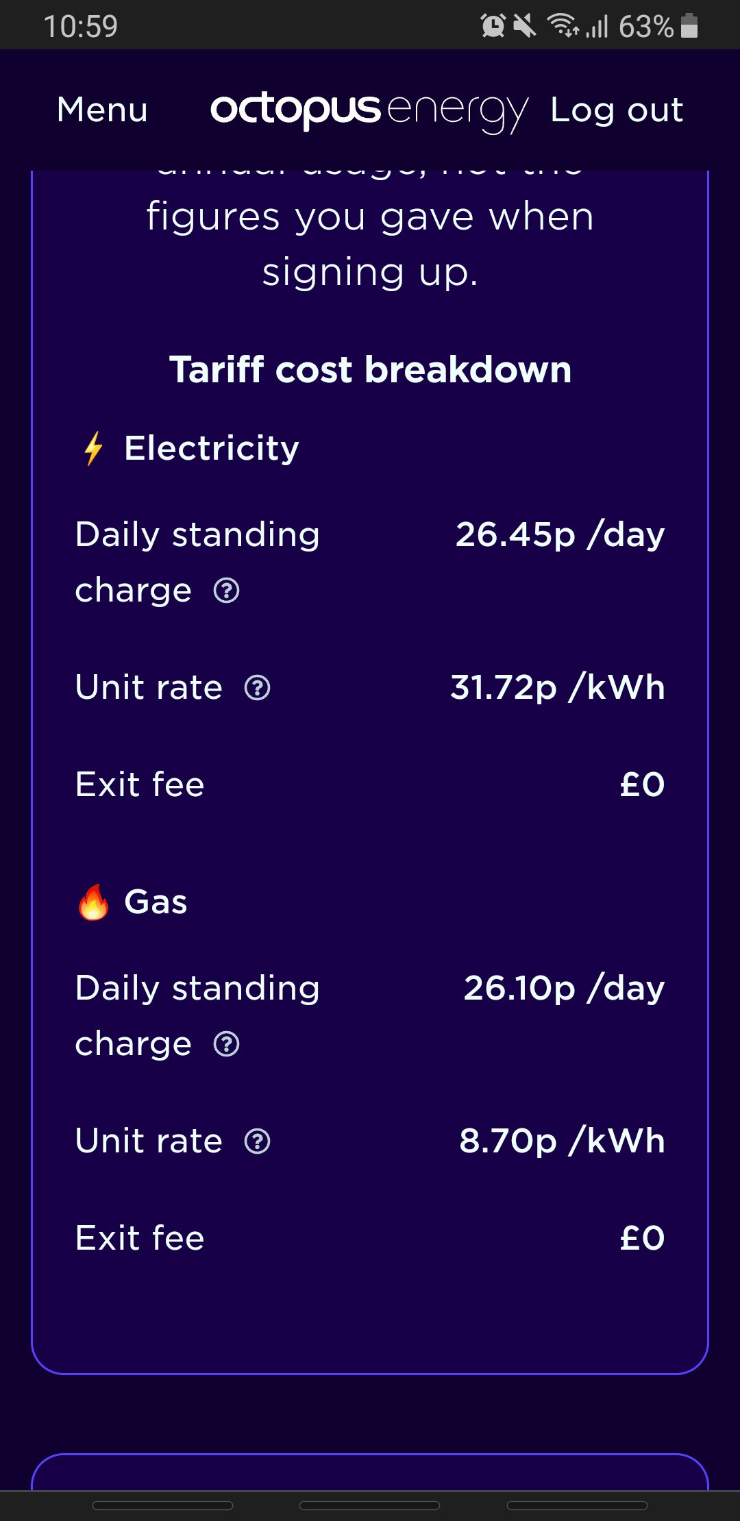 The standing charge is what you pay every day, whether you use any energy or not, so as a year has 365 days, the standing charge for a year is(365 x 26.45) = £96.54 PLUS (365 x 26.10) = £95.265 Standing charge total £191.81Gas, multiply the unit price by the number of units, so(8.70 X 4312) = £375.14Electric, multiply the unit price by the number of units(31.72 x 1071) = £339.72Then to find the total bill, add the standing charge, gas & electric(£191.81 + £375.14 + £339.72) = £906.67Normally, you pay 1/12 th of this per month, so monthly payment = (£906.67 / 12) = £75.56The proposed cap is 1.5 p less per unit of gas, so it will be cheaper even taking into account the higher standing charge for electric.However, it may shoot up again in October, or it may come down in between.Also, you use less gas in the period April-September (about 1/3rd of what you use October-March)If you have monthly meter readings, you can work out the April - September figures (remember to halve the standing charge though)I fixed mine on the Octopus loyalty fix that was offered 2 weeks ago, the gas & electric were slightly cheaper. Over April - September I save about £1, but lose a lot Oct- March, so I'm hoping that either the October cap is higher, or there are better fixes about in the Summer.