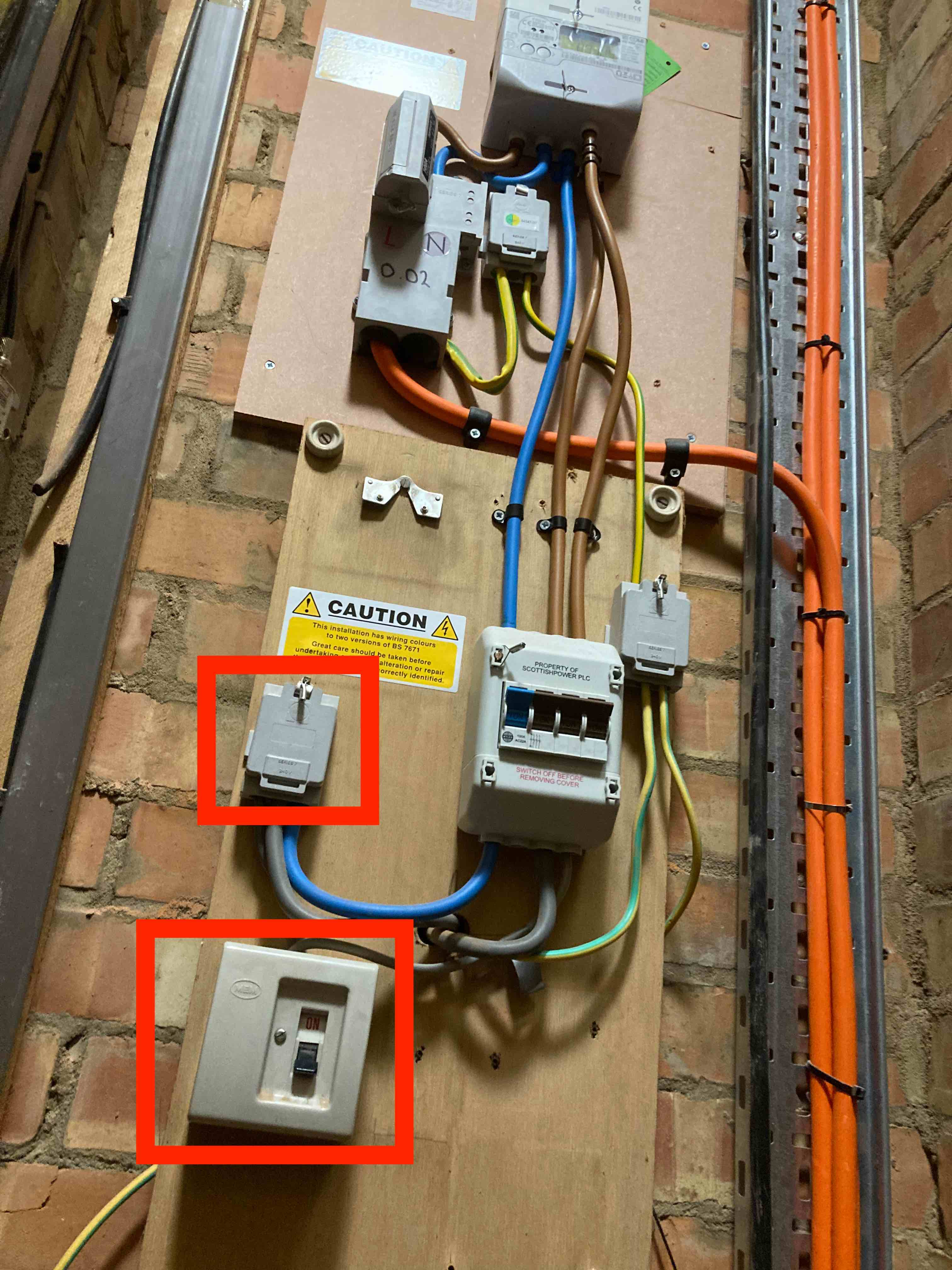 Power comes from youir main incoming supply (the orange cable) through the DNO fuse (the grey rectangular fitting with "L N 002" written on it) then comes out as live (brown), neutral (blue) and earth (green/yellow). you can forget about earth.Live and neutral (brown and blue) go to your meter. They come out as blue and brown and go to the isolator (the four-pole switch). Inside the meter there is also a contactor (switch) that is controled by the meter clock. This switch connects the incoming live to the "other" live (brown) terminal on the meter (the 5th terminal); this is the one slightly in front of the others and with three cable ties around it. Power on that live (brown) cable is meant to be switched by the E7 settings. That brown cable goes to the far-right position on the isolator.From the isolator, the neutral (blue) cable goes to the upper of your orange boxes. All that does is split the neutral connection so you it can then connect on from there to both main and E7 consumer units. if there was a problem there, things wouldn't get power.The intended-to-be permanent live (in the middle, now grey) will go to your main consumer unit and supply power to all your 24-hr circuits.The E7 switched live goes to your lower orange box. This looks to be a manual switch that your electrician has added to allow you to switch your E7 circuits on and off. From that switch the cable will go to your E7 consumer unit. A manual switch can't create power if there's no power there to start with.The supply to the switch (lower orange box) is controlled by the smart meter and should switch on and off with the E7 times. There is no way for your electrician to affect that. From what you've said, it isn't and the only control you have over your E7 circuits is by operating that switch.N. Hampshire, he/him. Octopus Intelligent Go elec & Tracker gas / Vodafone BB / iD mobile. Ripple Kirk Hill Coop member.Ofgem cap table, Ofgem cap explainer. Economy 7 cap explainer. Gas vs E7 vs peak elec heating costs, Best kettle!