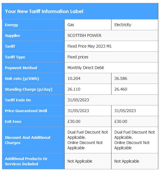 How is it 26p and 36p when the sp quote says All unit rate 36.519pfacade said:You need to tell usyour annual gas consumption in kWhelectricity consumption in kWhand what you have been offeredGas standing chargeGas price per kWhElectricity standing chargeElectricity price per kWhThe SP M1 tariff is about 10p per kWh gas, 36p electric, and a standing charge of around 26p a day for each. It saves around 20p a day on the standing charge, and over charges about 8p on electric and 3p on gas.Unless you use a very small amount of energy, the April energy cap is lower than what you would be paying.No-one knows what will happen in October though.....You've quoted your unit rate, 36.519p/kWh, which is "about 36p" as facade said.What you haven't quoted is the daily standing charge. Facade thinks it will be around 26p/day.You also haven't given us any information at all regarding the gas tariff you've been offered, which facade thinks will be around 10p/kWh and 26p/day.Please can you give full details of the tariff Scottish Power have offered, in the same way as you've given us full details for your existing tariff.N. Hampshire, he/him. Octopus Intelligent Go elec & Tracker gas / Vodafone BB / iD mobile. Ripple Kirk Hill Coop member.Ofgem cap table, Ofgem cap explainer. Economy 7 cap explainer. Gas vs E7 vs peak elec heating costs, Best kettle!
