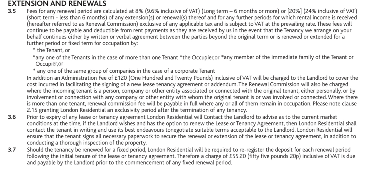 With regards to the lettings terms of business - I assume this is as long as the tenancy is active. And the cancellation terms seem to be related to early cancellation. We are not cancelling early. Simply to not continue with a renewal.The ’cancellation’ part of the terms and conditions:“NOTICE OF RIGHT TO CANCELYou may have the right to cancel this contract under the Consumer Contracts (Information, Cancellation and Additional Charges) Regulations 2013 within 14 calendar days from the date upon which it was signed. Notice of Cancellation MUST BE IN WRITING and should be delivered or sent by post to the Cancellations London Residential Services Limited and by email to cancellations@lrsl. Any Notice of Cancellation is deemed served on the day that it is delivered, posted or sent. If you have given us your written agreement to market your property within the cancellation period you may be required to pay our commission fees if we have introduced a tenant to your property prior to your serving a Notice of Cancellation.NOTICE OF CANCELLATIONIf you wish to cancel this contract, you MUST DO SO IN WRITING and you may complete, detach and use this section to do so. Please ensure that it is delivered or sent by post to the address given above, or emailed to cancellations@.”