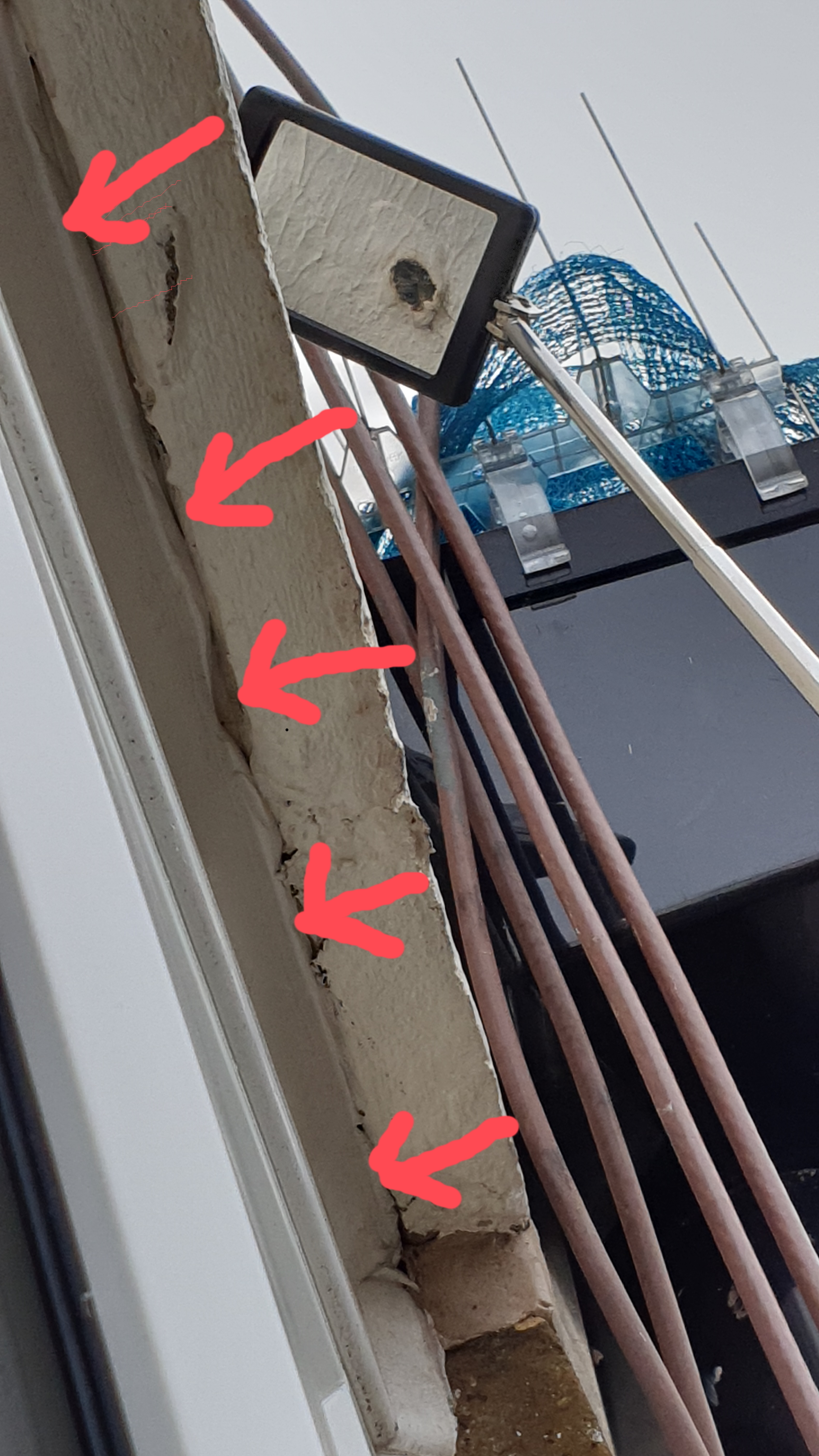 Back in summer 2020, they did some work which involved attaching scaffolding to the building and left behind holes which were not filled after work finished. Could this be the source of the problem? I can't find much information about it but it's a hole directly above the window area and surely can't be good for the building? They are called putlock holes according to Google