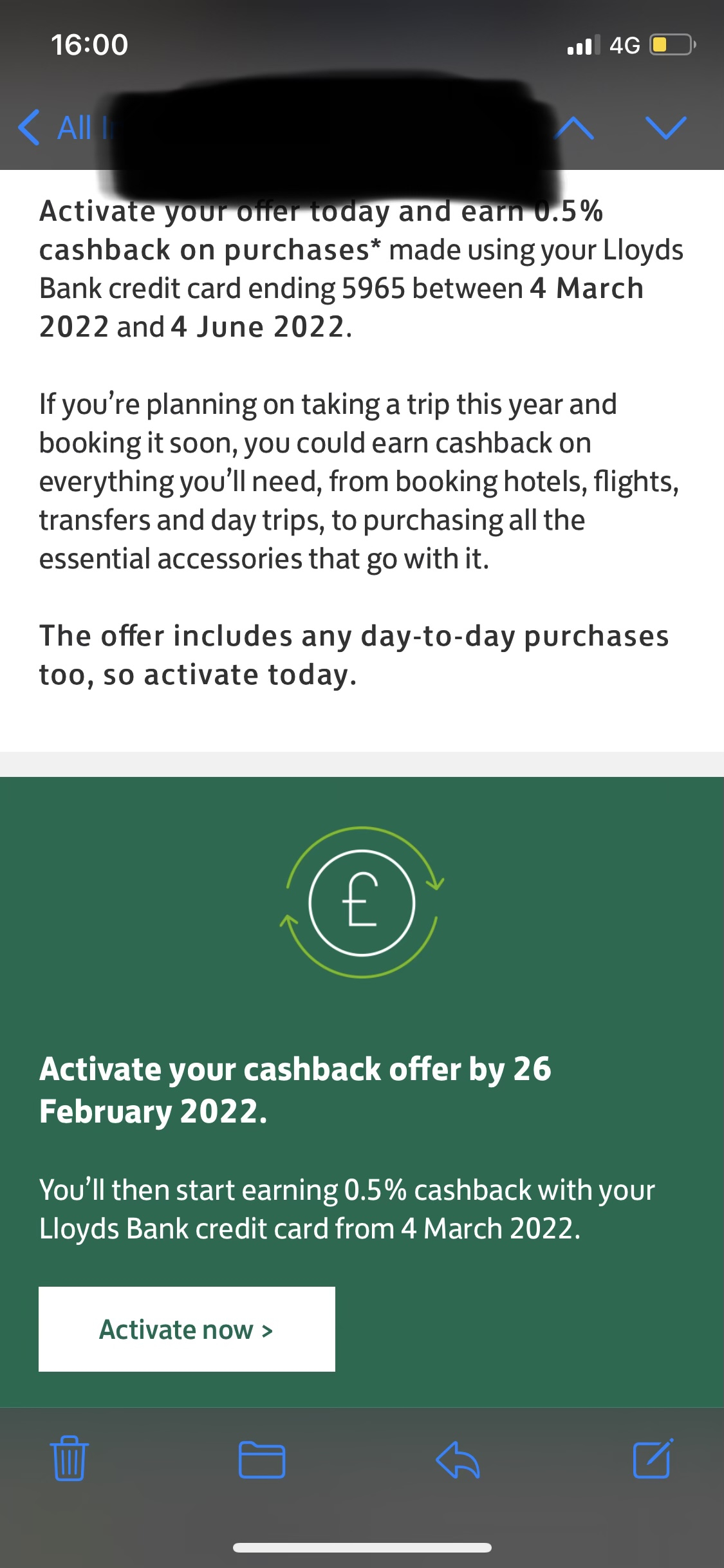 Received a cash back offer on my lloyds platinum credit card. So, if anyone else wants to take advantage of this offer, just a heads up.