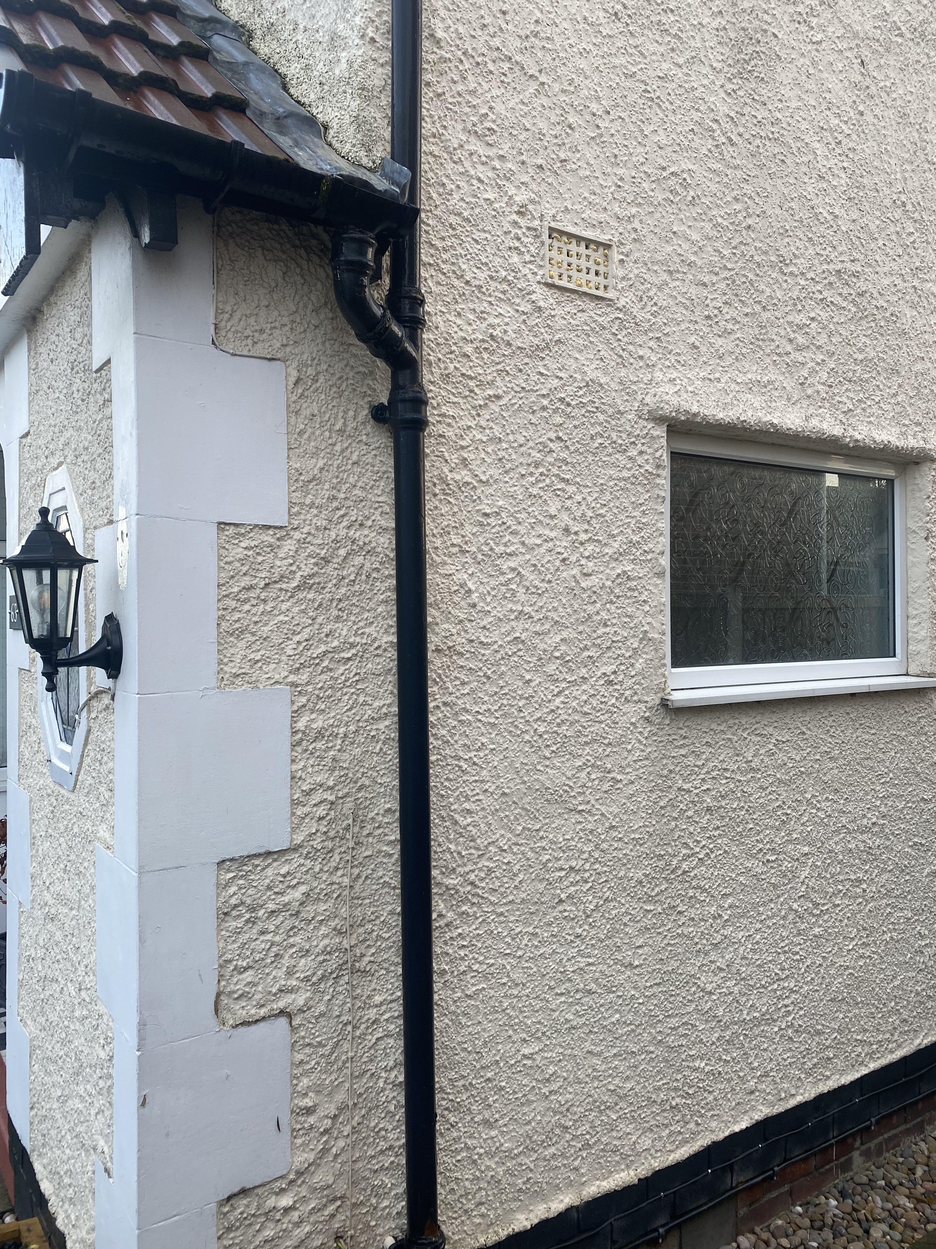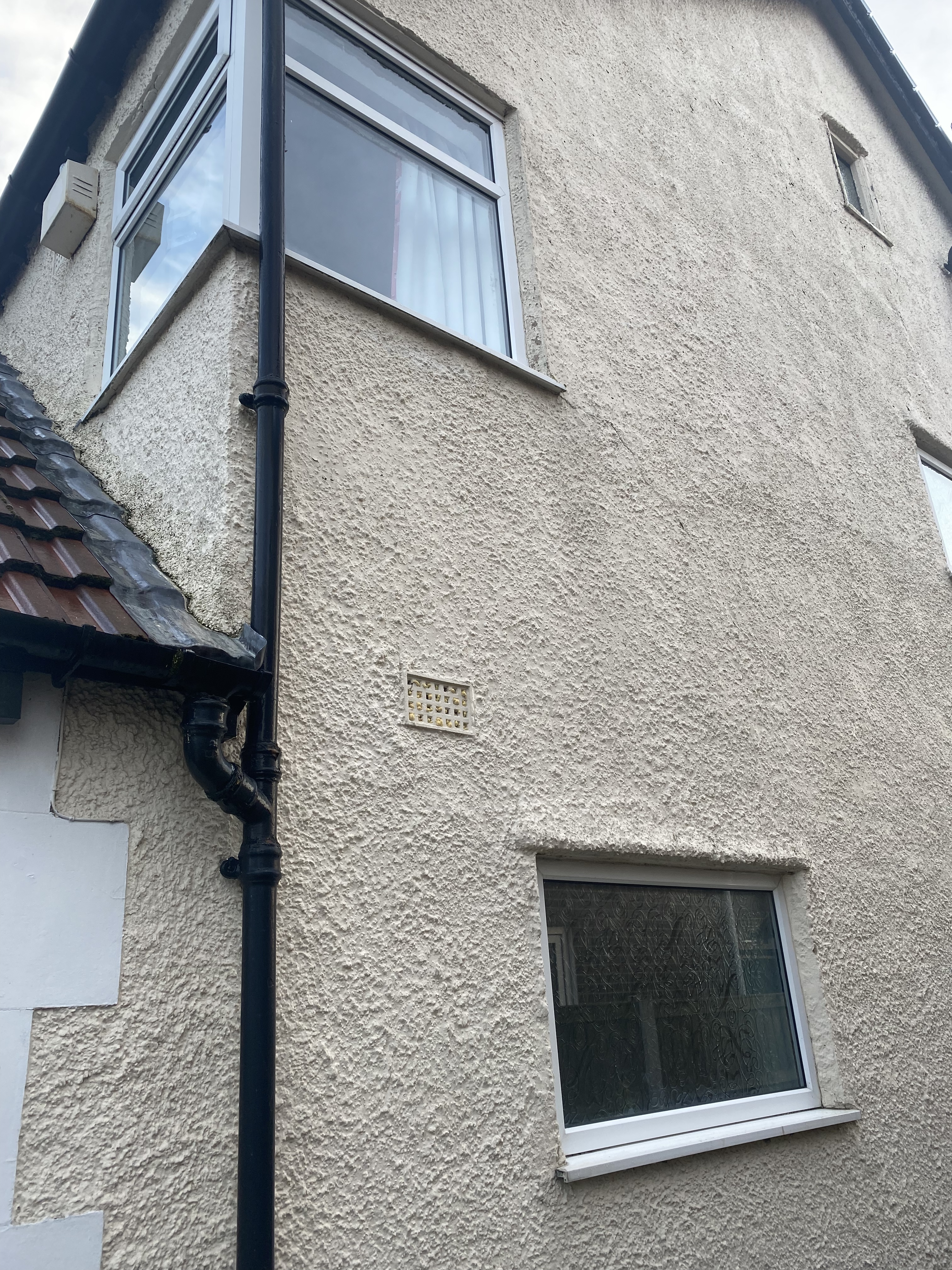 Yes, I see that crack.I guess any water getting through there could be making it's way to that vent where it'll have a path to the core of the wall, and likely to the lintel above the bottom window - which is where some of it is coming in.Are you up for investigating - putting a ladder up and seeing where that crack starts at the cill of the upper window - any gaps there? Does the render sound solid or hollow?0