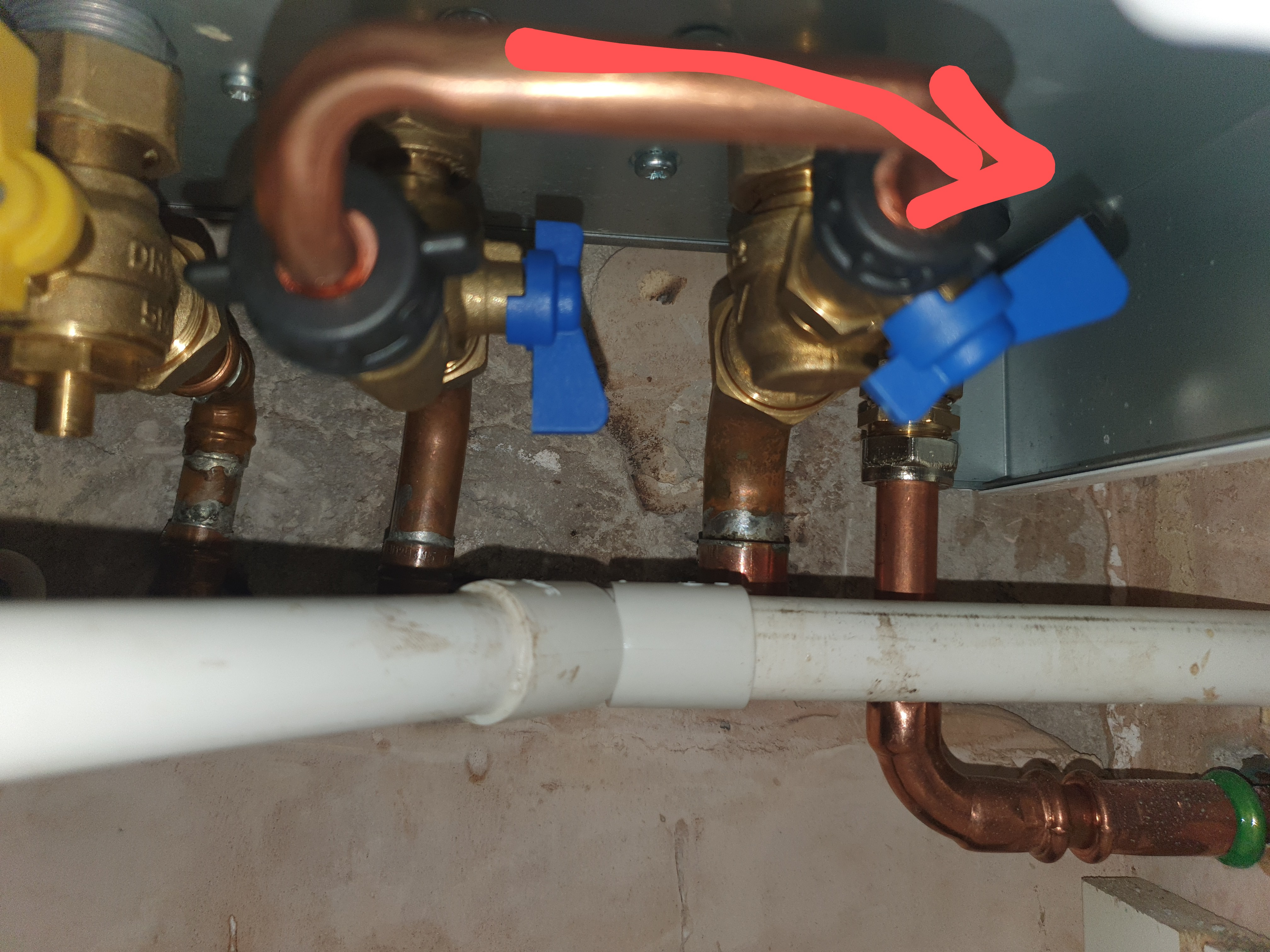 Yes of course! It's really hard to get a pic so I've drawn an arrow to show where it is, it's a black valve behind the blue one. We keep the sandwich toaster and all sorts on a shelf just under the boiler, whether a wire has caught it, I just don't know. I haven't studied it much since it started working again, I can't look at it for long at the moment. I'm still recovering 😃 No idea why the heating was acting as it was because of it.Bendy_House said:Blimey! I didn't expect that!