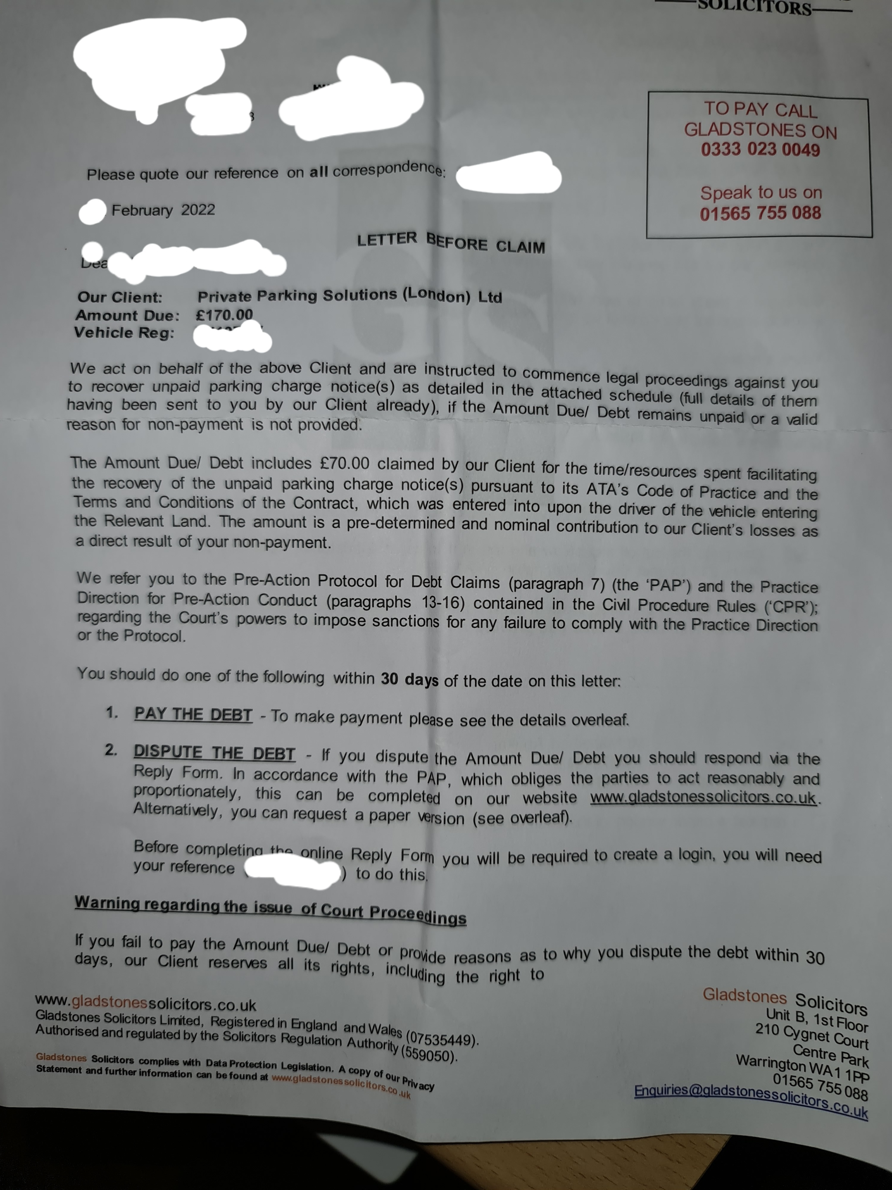 Read the Newbies thread 2nd post (the part about LBC stage - see my signature because you don't need another link) and request a SAR from the parking firm and also email Gladstones, letting them know that you have emailed their client requesting a SAR and that the case myst be put 'on hold' for at least 30 days.