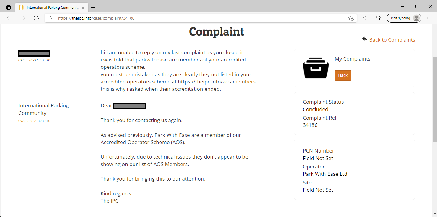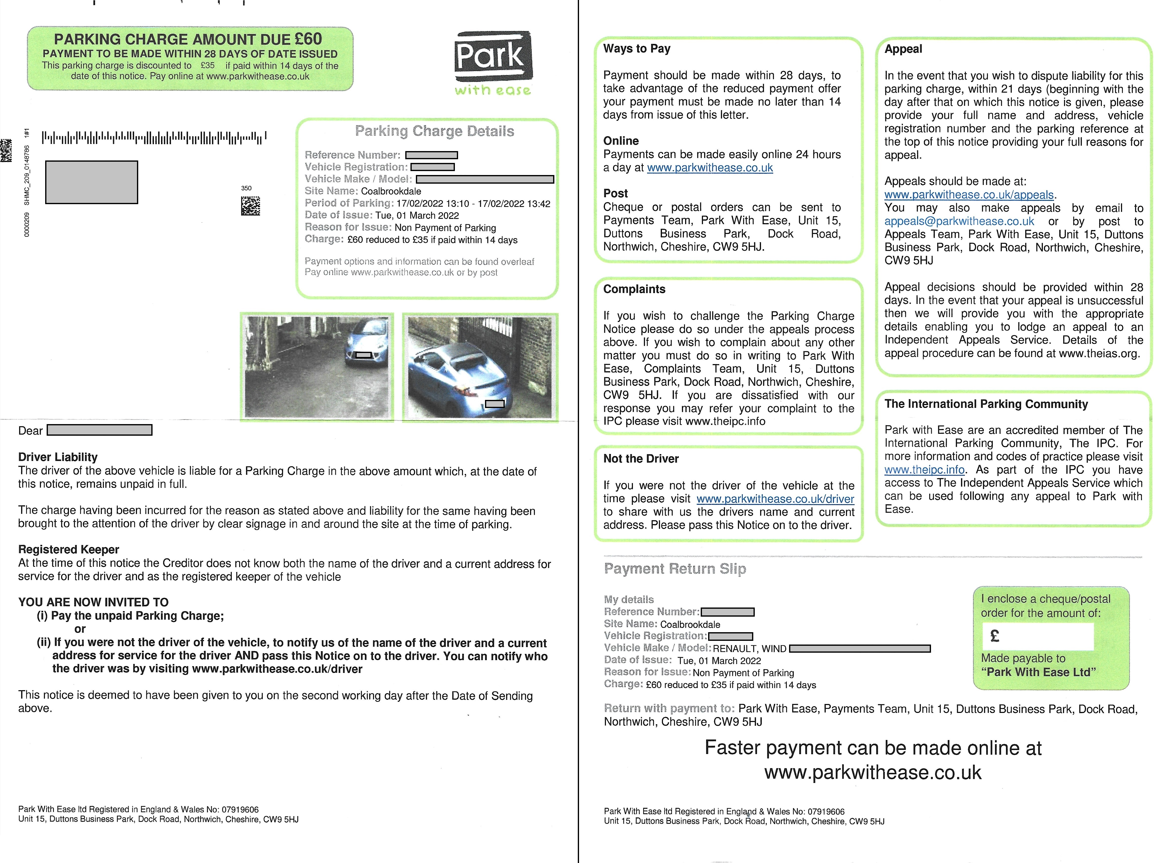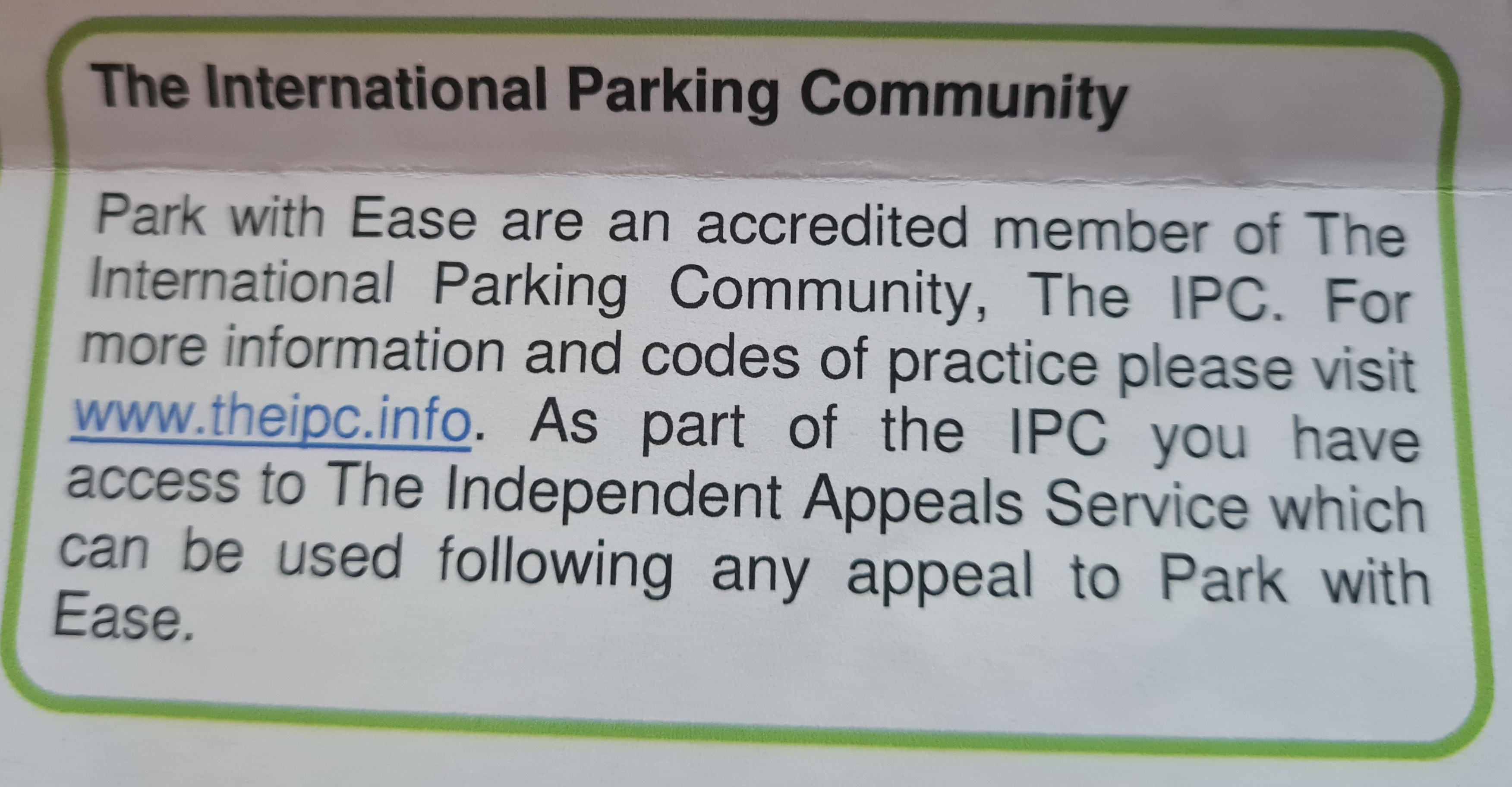 complained to IPC pionting out that their letter claims they have accreditation while IPC do not list them as accredited & asking when their accreditation ended.-- got a reply already from IPC conforming that parkwithease are an accredited member. strange as they are still not listed in the AOS accredited listcombined both sides of the letter into a single image & redacted any personal / idetifyable informationlooks like they have the appeals covered on the back pagehmm the carpark owner claim they have a "30 minute free period to allow pick-up & drop-off."https://www.ironbridge.org.uk/plan/how-to-get-here/#car-parks while parkwithese have claimed in email that there is a 10 minute grace period and that i am being charged for being over the free 10 minutes.