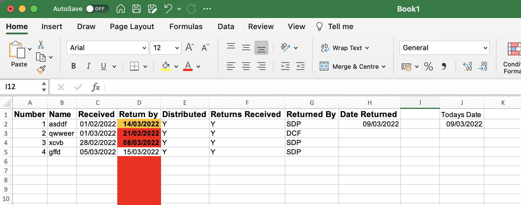 I'm trying to create a formula to show me when dates for returning documents are coming up/over due. I've got the basic formula for highlighting the cells when they are coming up/overdue using conditional formating. However I'd like to take it a stage further and when we have returned the documents then they change back to unfilled and non-bold formatting. I've enclosed a mock up of the spreadsheet as I may not be making much sense without it.