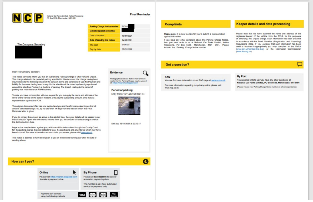 in the reminder which is address to Company Secretary, they state the following 'We, National Car Parks Limited, are the creditor. At the time of this notice we do not know both the name of the driver and a current address for service for the driver and as the registered keeper of the vehicle '