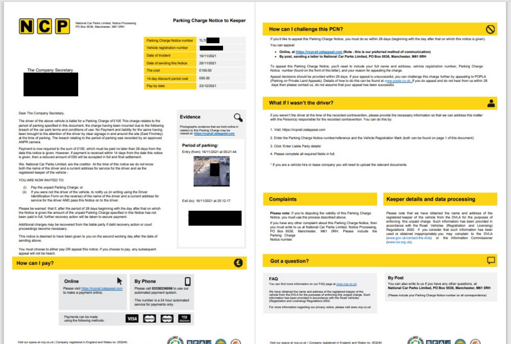 No NTK ever received. So this was the absolute first notice we had of any parking charge.