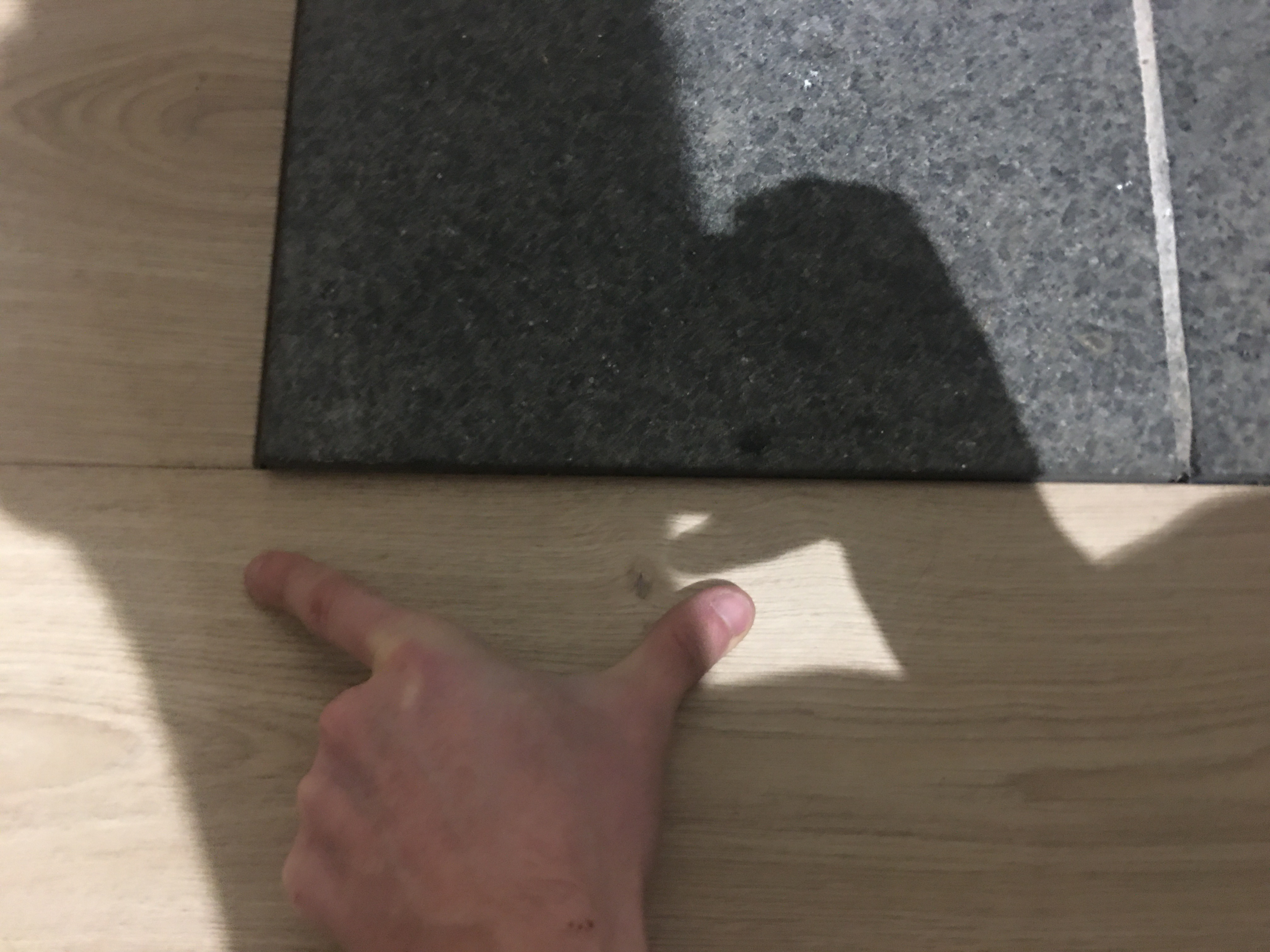 A very small portion of the laminate is now touching the tile. We’re talking 15cm. The rest of the planks running along the tiles have a few mm expansion gap still (the tiles aren’t perfectly straight, hence the uneven expansion gaps).