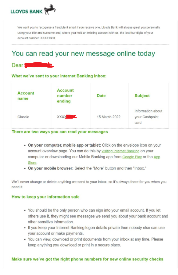 Have anyone of you received yesterday / today an E-Mail from Lloyds with a notification about Internet Banking message with a subject "Information about your Cashpoint card"? I have never had any still do not have any cashpoint card and I wonder why they sent it to me. I've called Lloyds and they also can't explain the reason.
