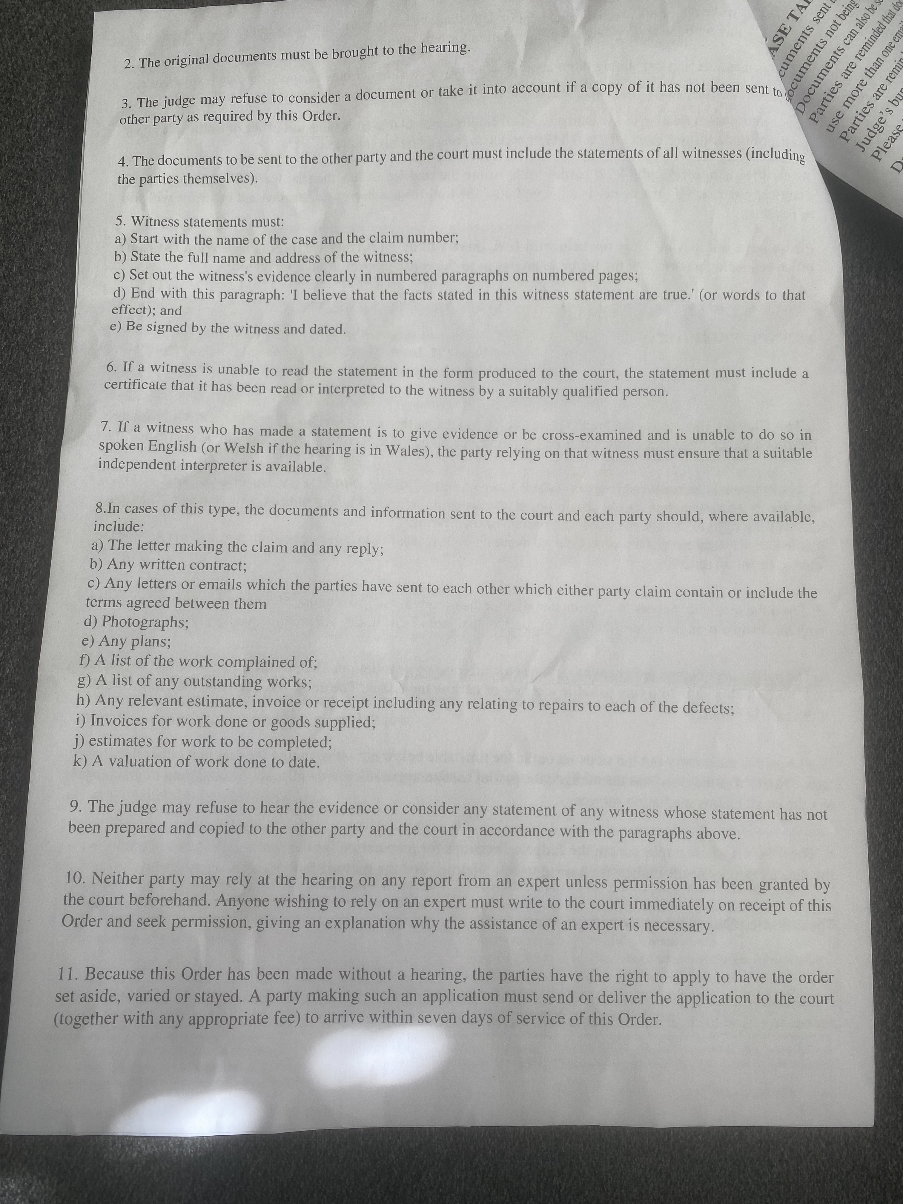 You primary job now is to produce a witness statement based on the ones suggested by Coupon-mad, and include numbered exhibits including your photos, and copies of court cases that support you defence.