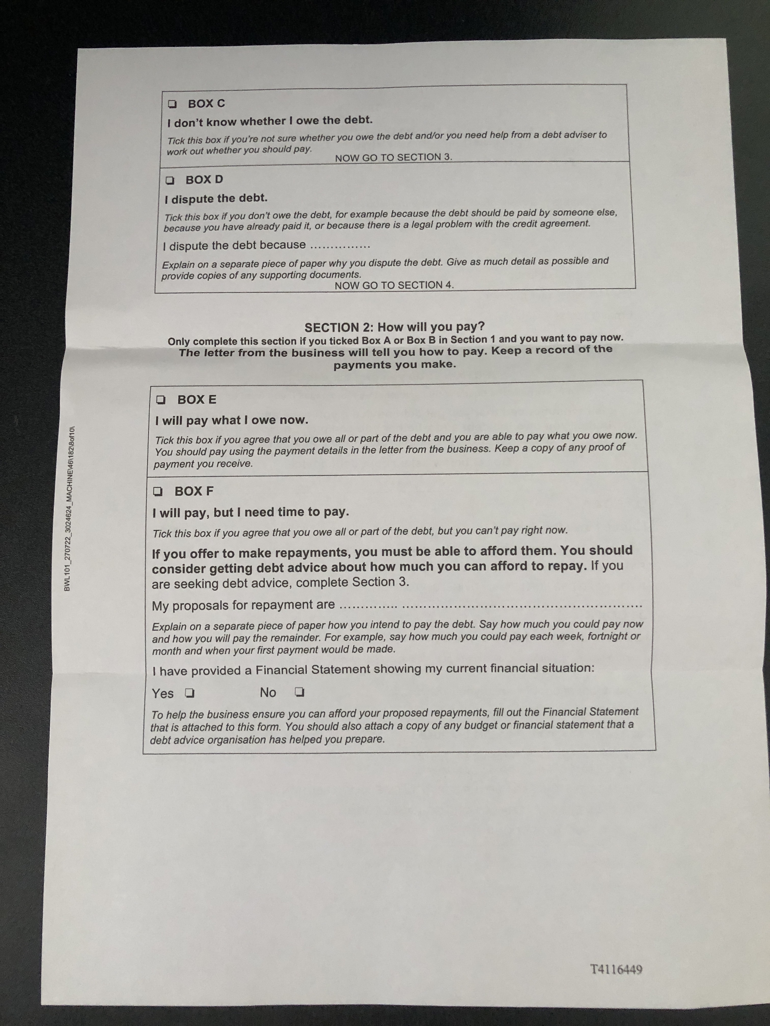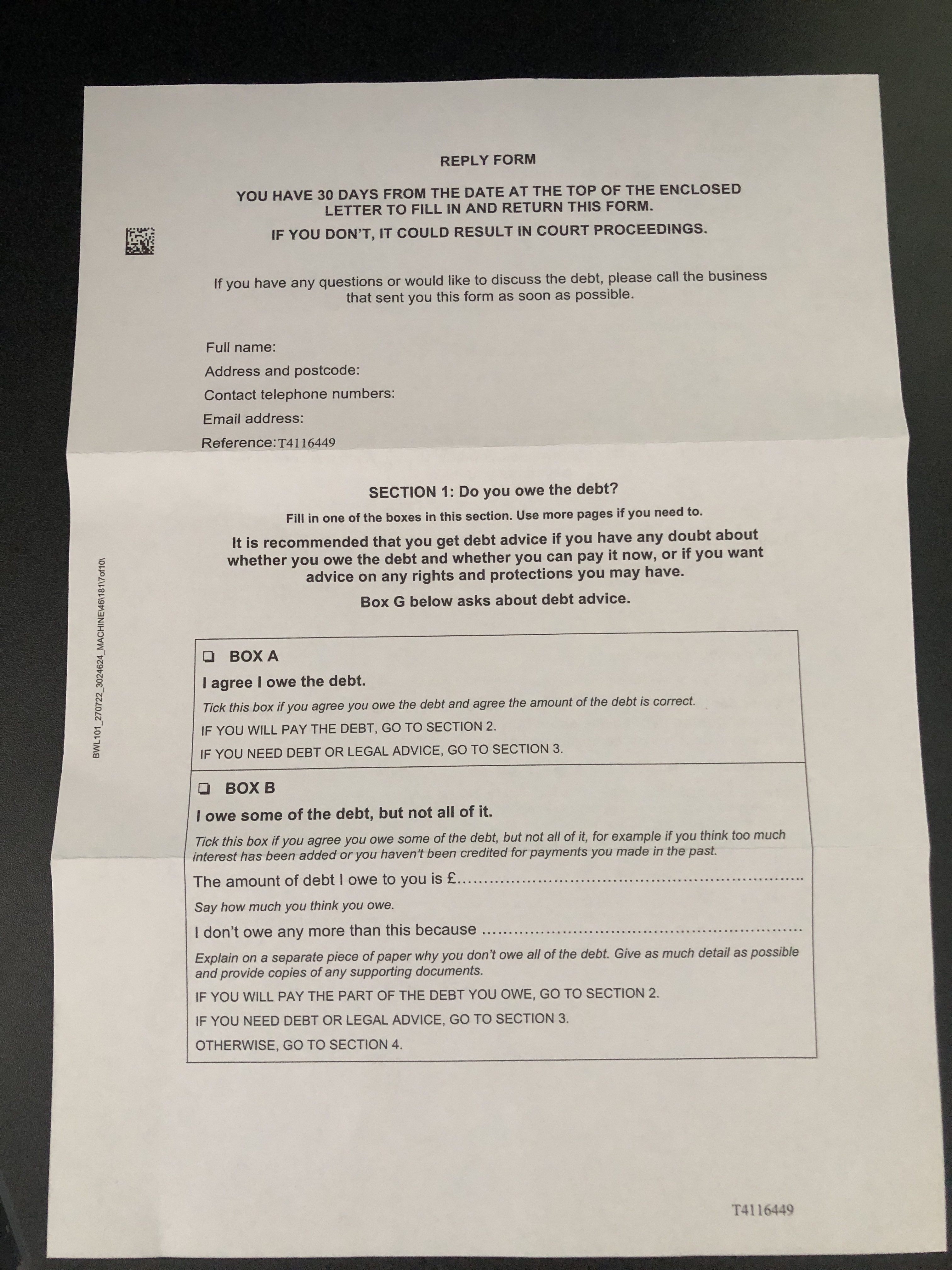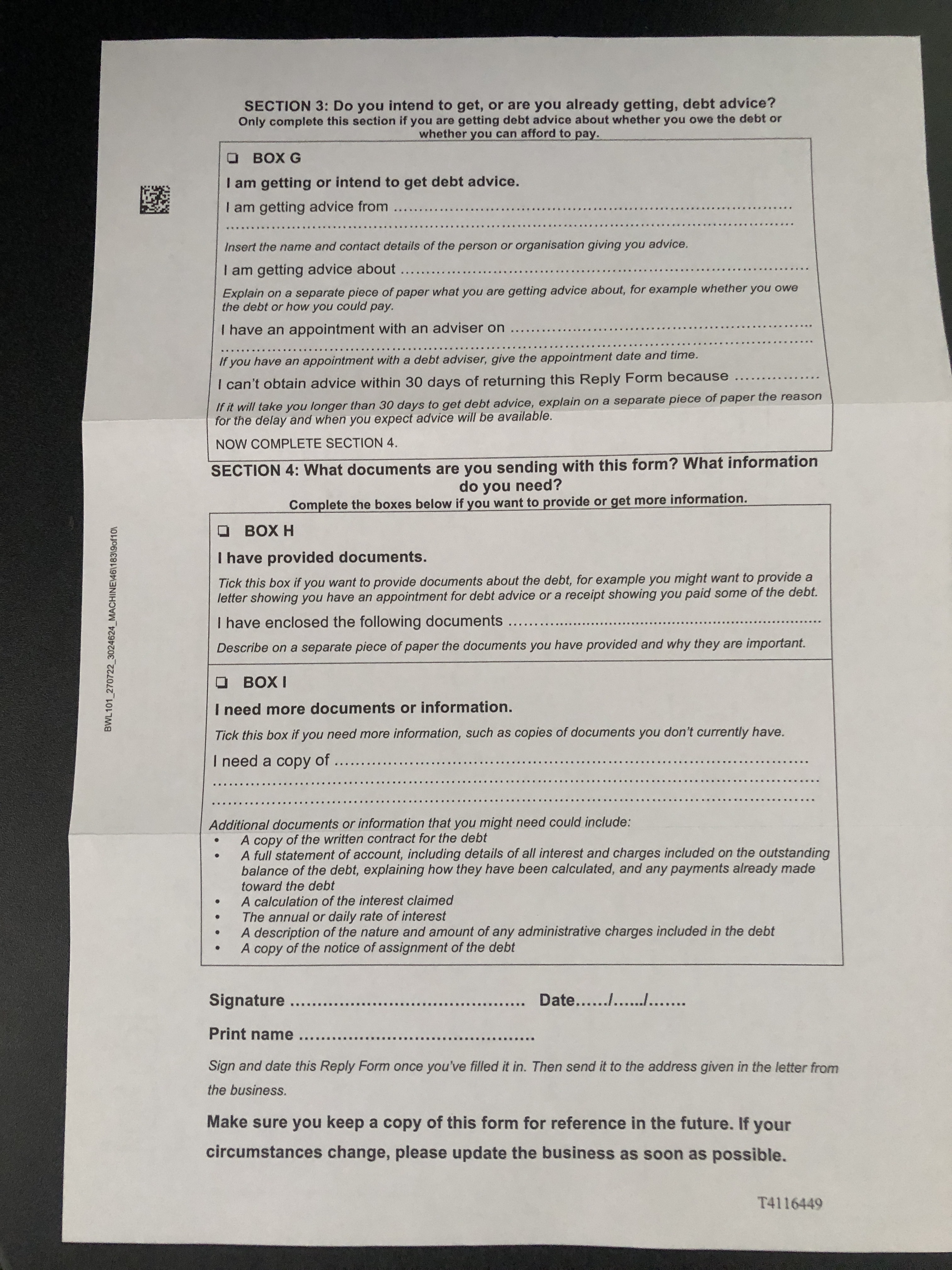 So you ignore and bin those forms and now what you do with a letter before claim is to to TELL BWL that you are seeking debt advice and to extend by a further 30 days. IT'S THE LAW, THEY MUST DO THAT