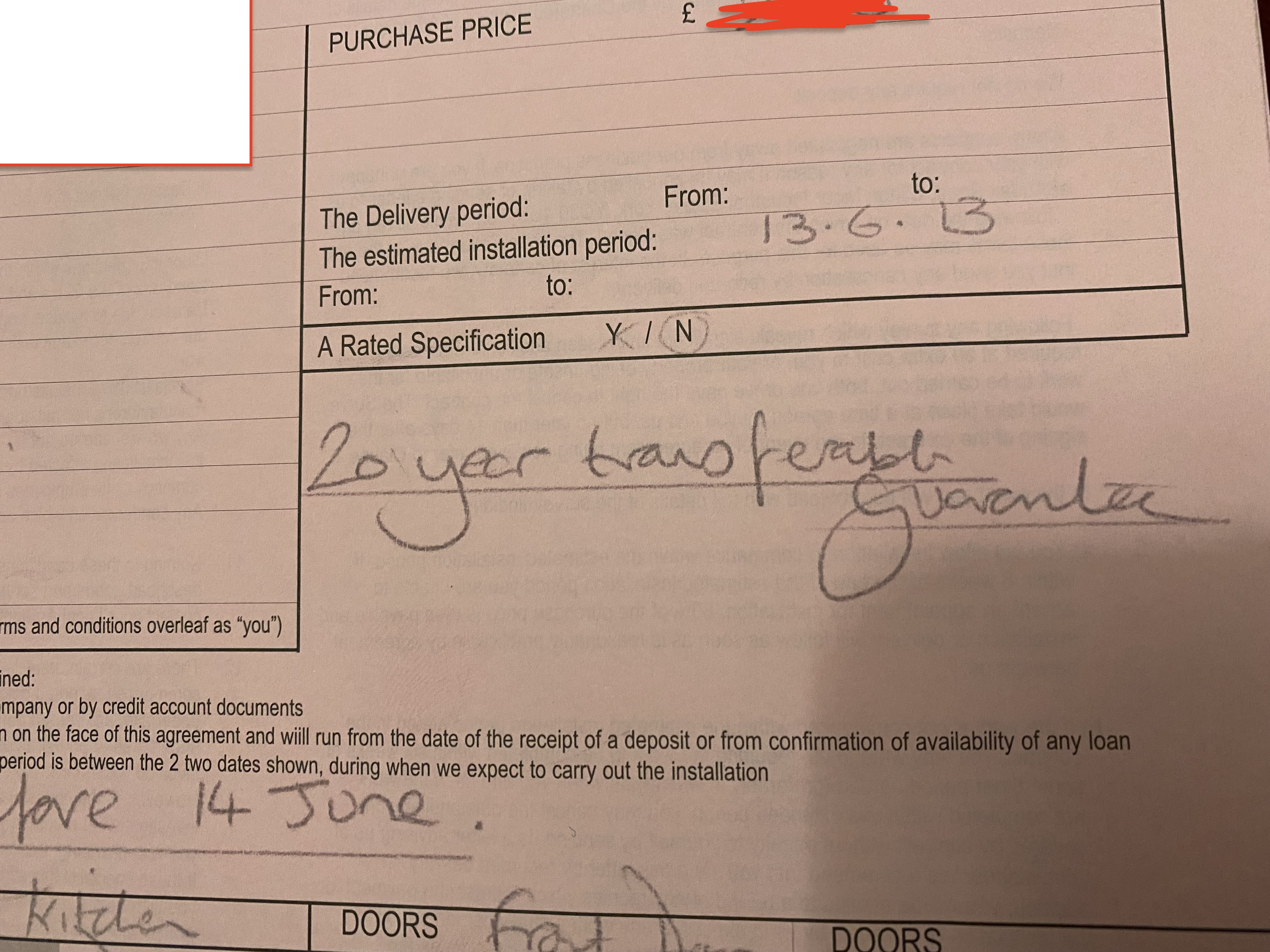 Here is the contract that states 20 year transferable guarantee and the terms and conditions that are printed on the reverse. Interesting to note that the terms and conditons on the back state that the guarantee is not transferable!