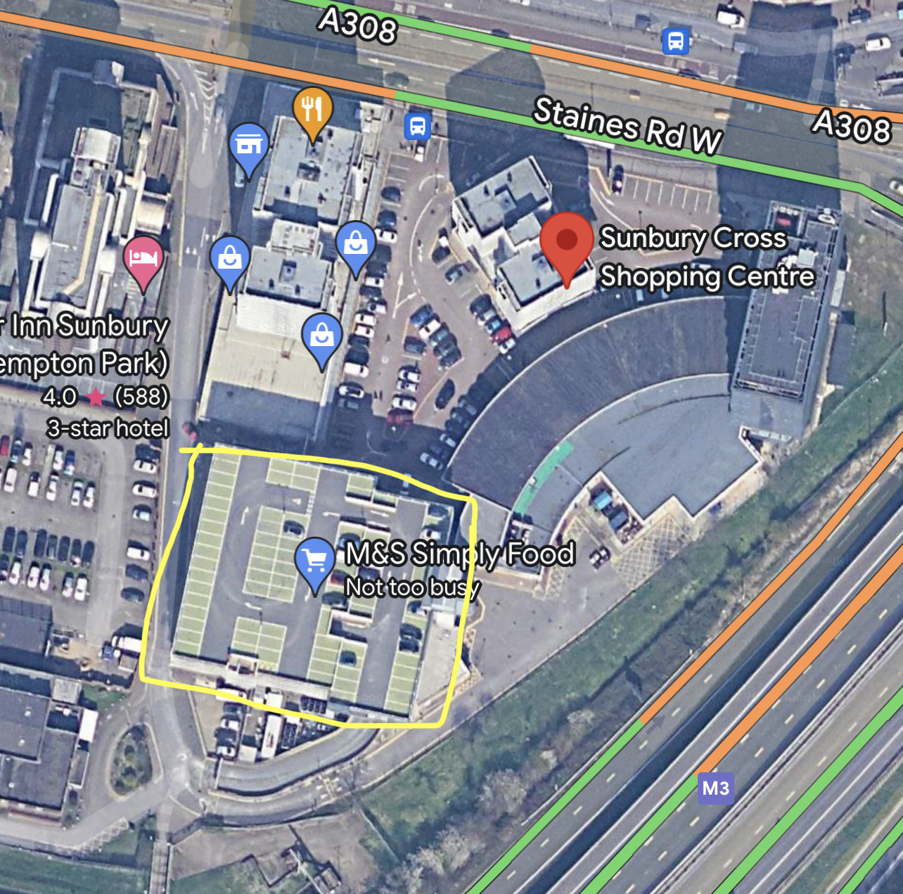 It’s in Sunbury on Thames. Multi-storey in yellow on image. M&S is below it but I’m not aware of them having anything to do with it.