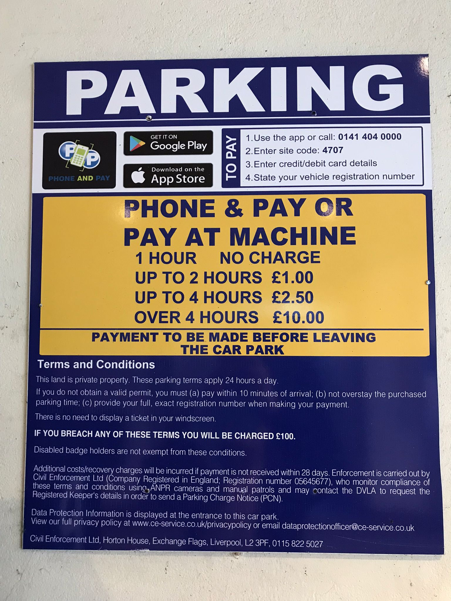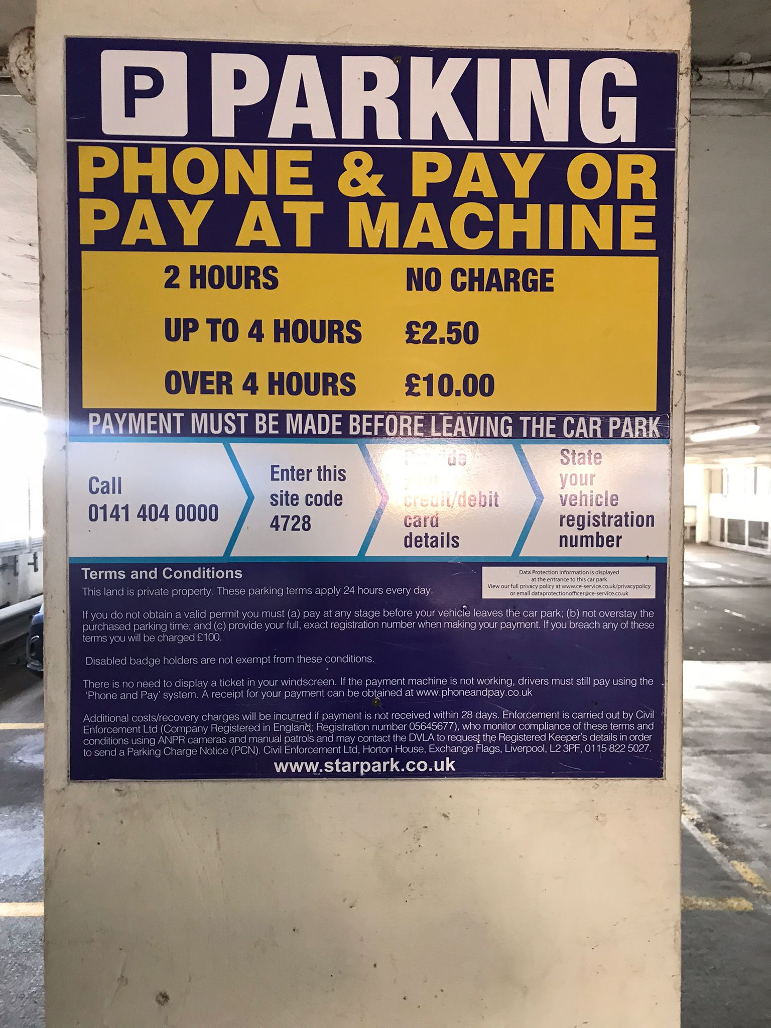 There's nothing to tell the reader that the listed terms only relate to the ground floor spaces and that they must instead seek out other signage, if parked in another storey of this car park, and there are no surface markings nor barrier delineation at all. It's all set up by CEL as a trap, IMHO. It's two car parks made to look like it's one.