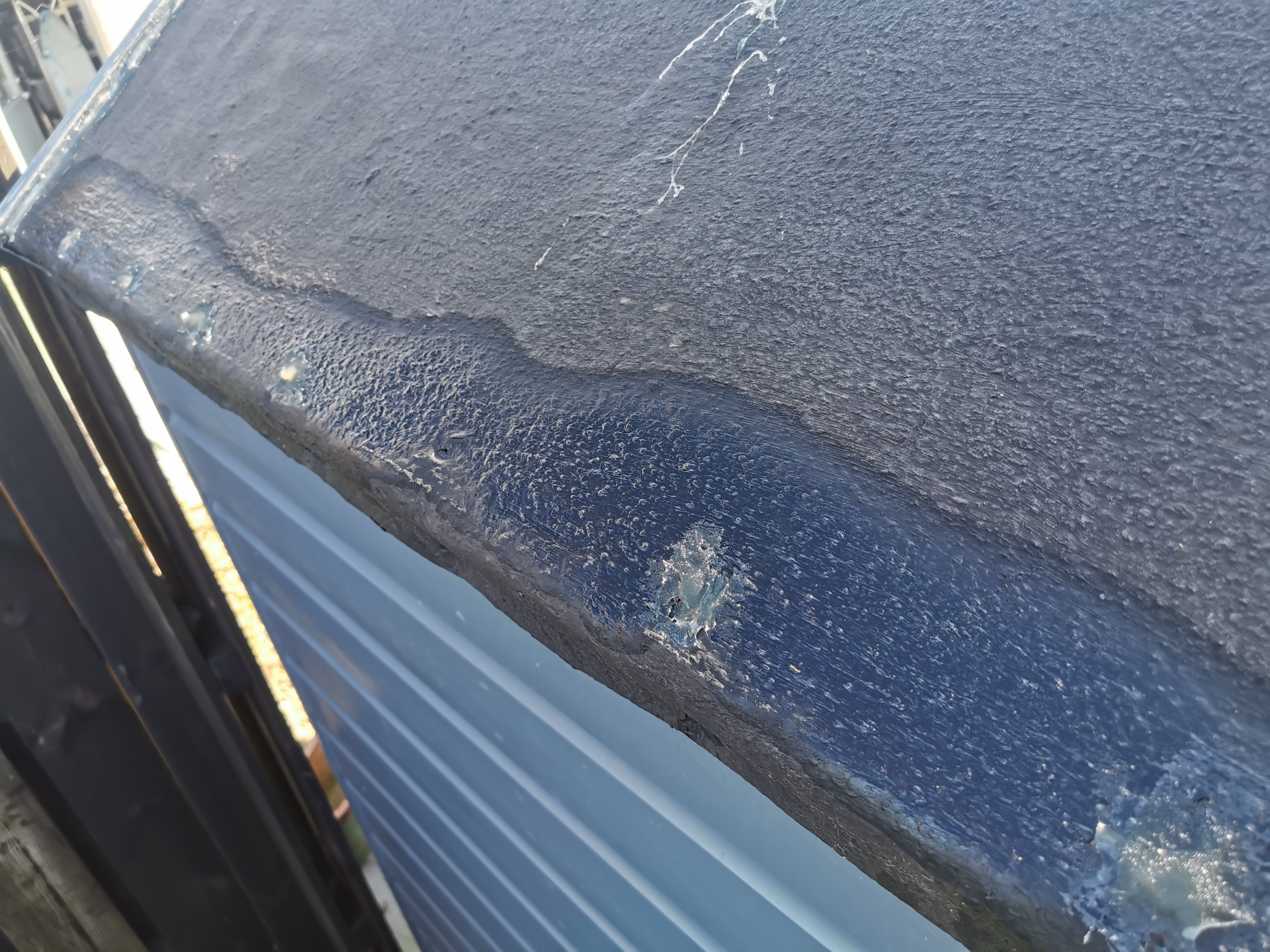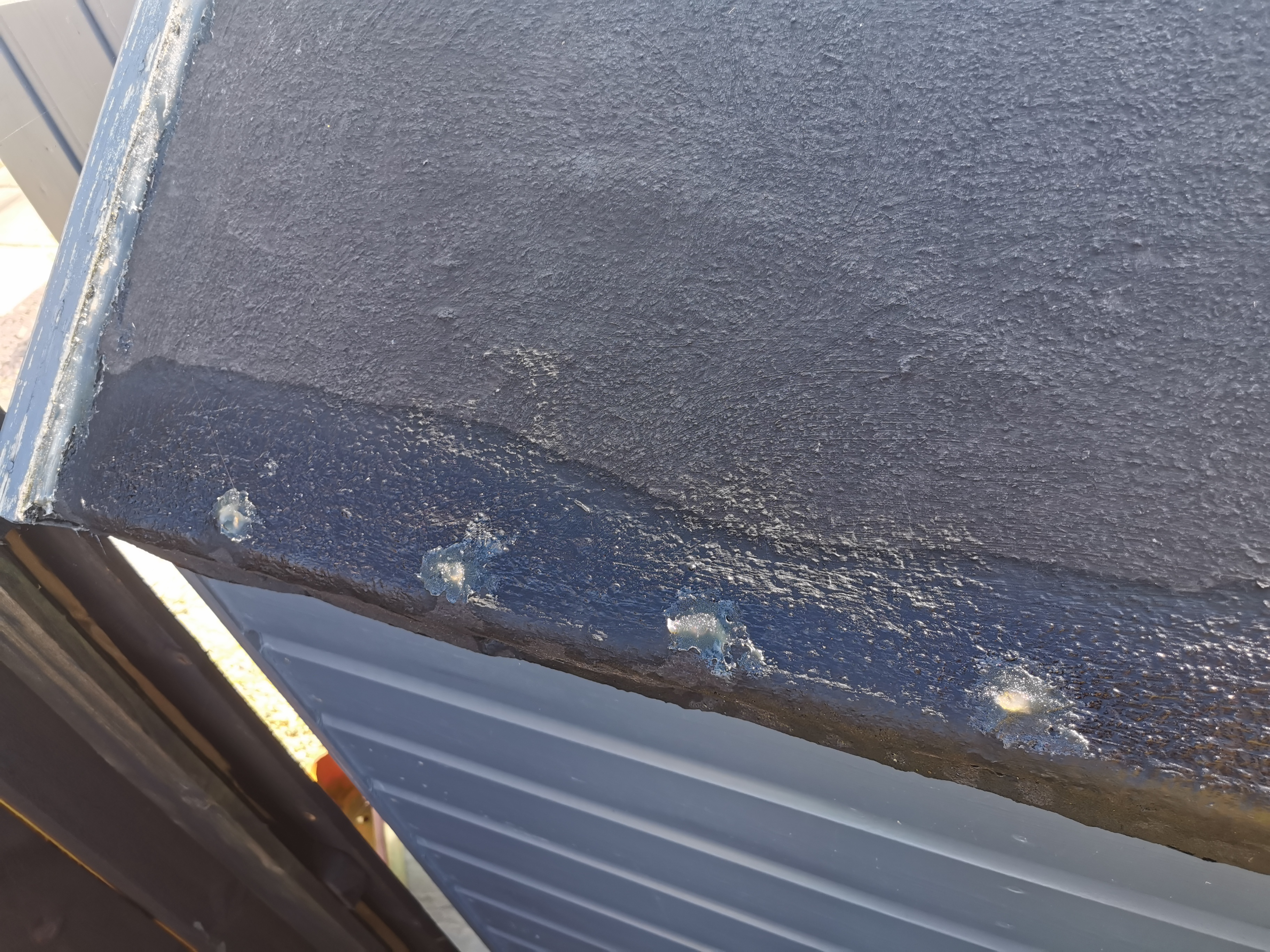 The roof itself looks in good condition but this morning I noticed that it looks like the photos which I will attach. It's as if the roof felt itself has soaked up water.