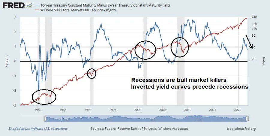Inverted yield curves are also on the agenda. The grey shaded areas are recessions.