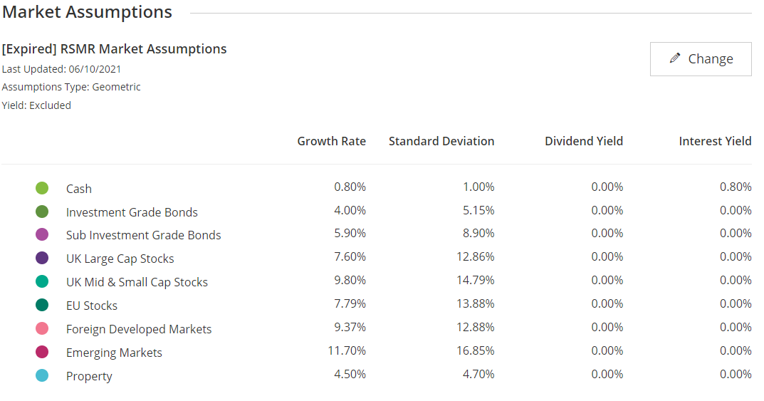 I ignore the Dimensional Fund and RSMR market assumptions. The way I set this up is to select chosen "inflation / growth"values in "plan settings". I have "Grow all investments and retirement accounts using asset allocation" in "Calculation Settings" set to "No". This ensures the only inflation / growth values active are the ones I have set. I currently have Inflation set at 3%, Savings set at 1%, Investments set at 5% (2% real). These are not set and forget parameters - they are subject to review and I have the investment and savings rates intentionally conservative.0