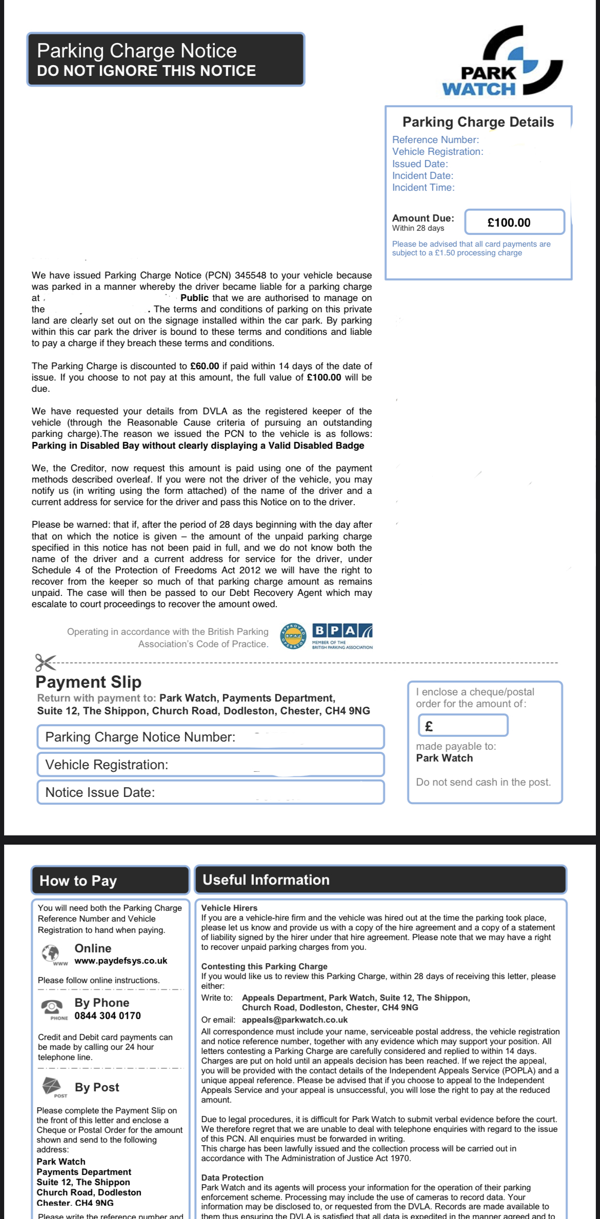 Did you send the 30 day hold instruction as near to the 30 day deadline you were given in the LBC? If so, did you tell them this was a hire/lease vehicle? If so, did you get a response? If so, what did it say?There is a copy of a postal pcn with a couple of pictures of a car parked in a bay.At the top it just says PCN do not ignore. The pcn was issued to your vehicle because the driver parked in a manor whereby they become liable for a parking charge. With the time and date. Then it says the driver is bound by the t&c’s and liable to pay a charge if the conditions are breached.They contacted the dvla for the registered keepers details ( I was never the registered keeper as it was CBS through VAG) so this may be the 10 day difference in offence date and issue date