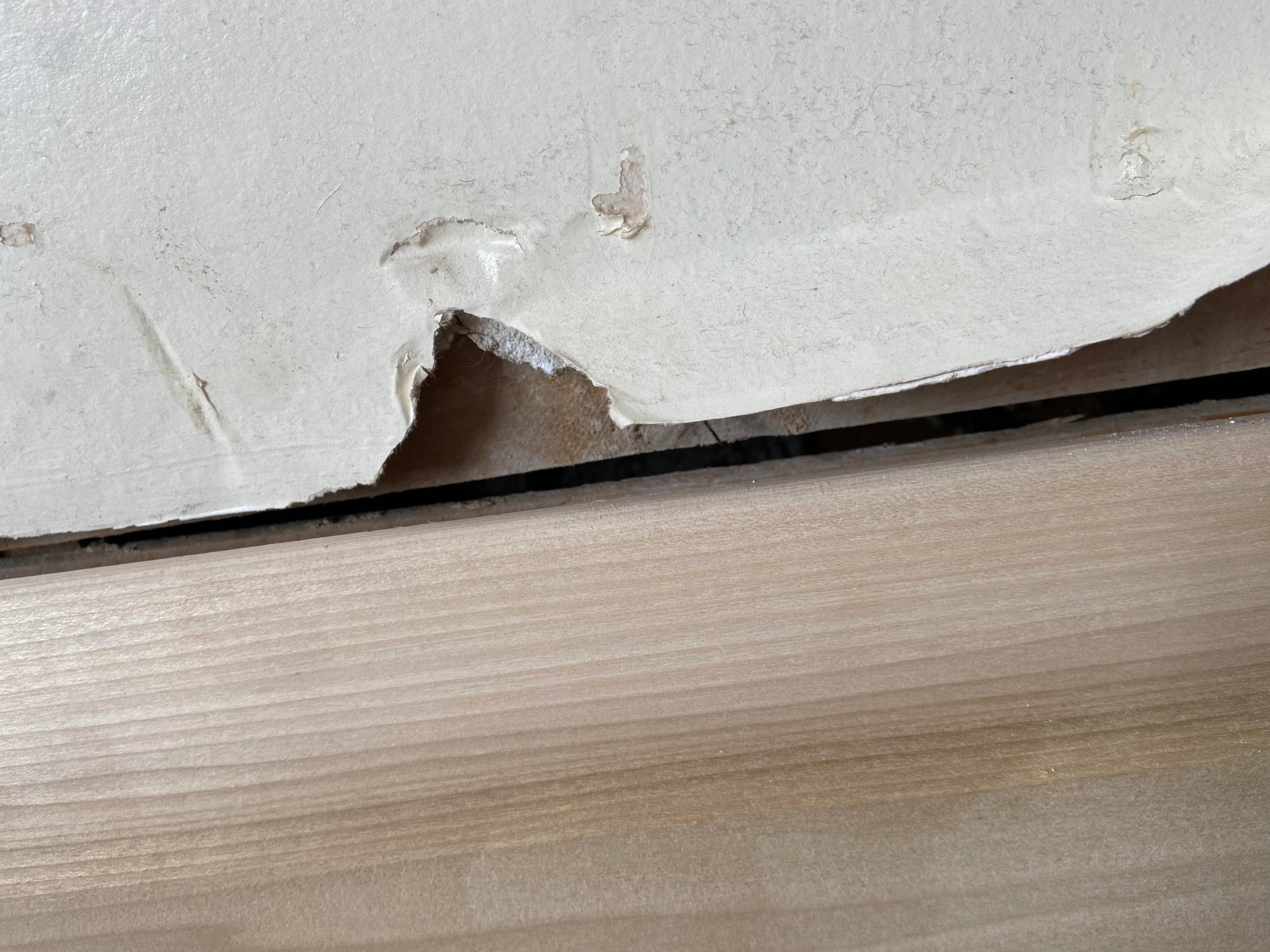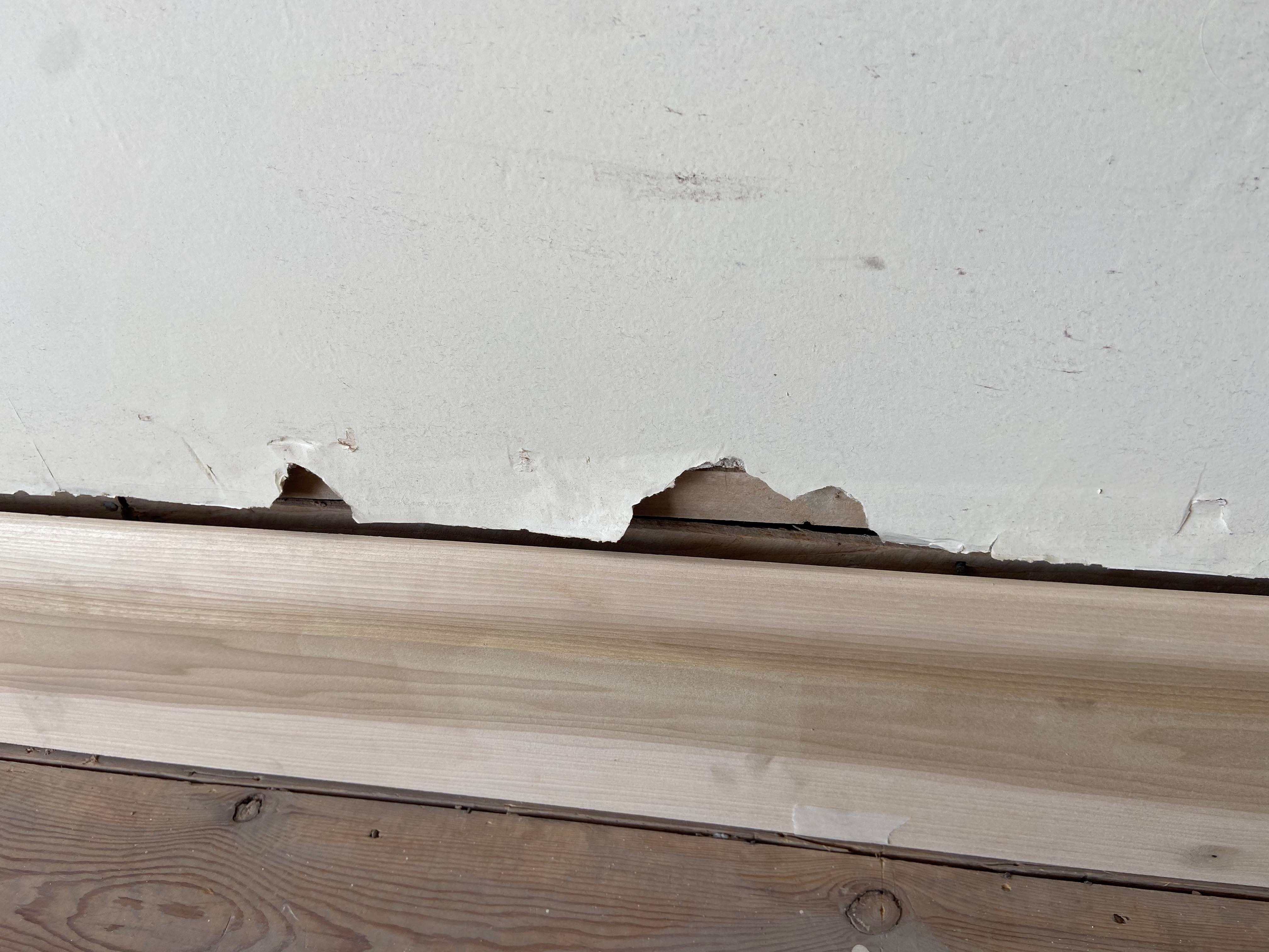 daivid said: It doesn't look like plasterboard to me, the paper is far too thick an the lath can be seen behind the plaster,<meh> It might be plasterboard, but there are a couple of wisps visible in one of the images that suggest hair. If the OP takes a closer look, if it is PB, there will be a layer of paper at the back.And yes, internal joints on skirting should always be scribed - It is not difficult, and you always end up with a neater job. A scribed joint also allows the skirting to expand/contract without it bowing out in the middle of the wall.
